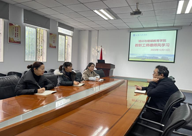 2023年12月13日下午,培训与继续教育学院开展师德师风警示教育集中学习活动。会议由杨飞副院长主持,继续教育学院程绪会、吴业令、张耀方老师参加了此次集中学习。
