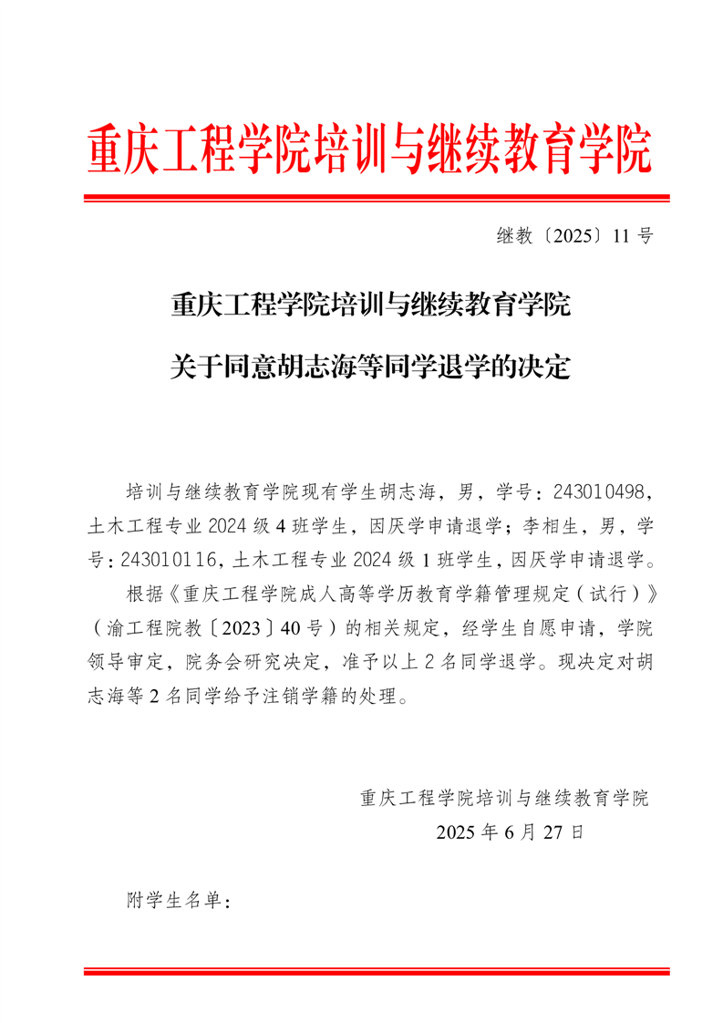 重庆工程学院培训与继续教育学院关于同意胡志海等同学退学的决定