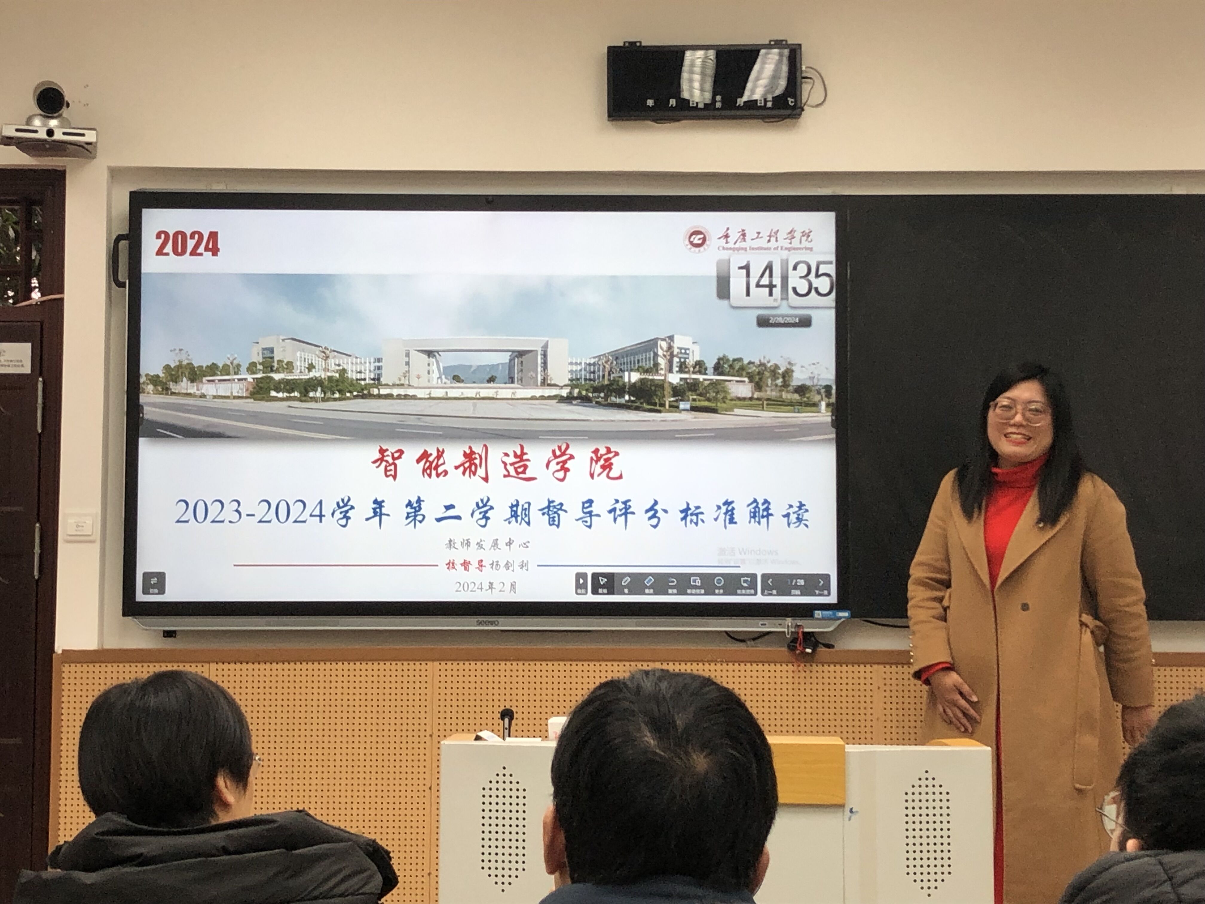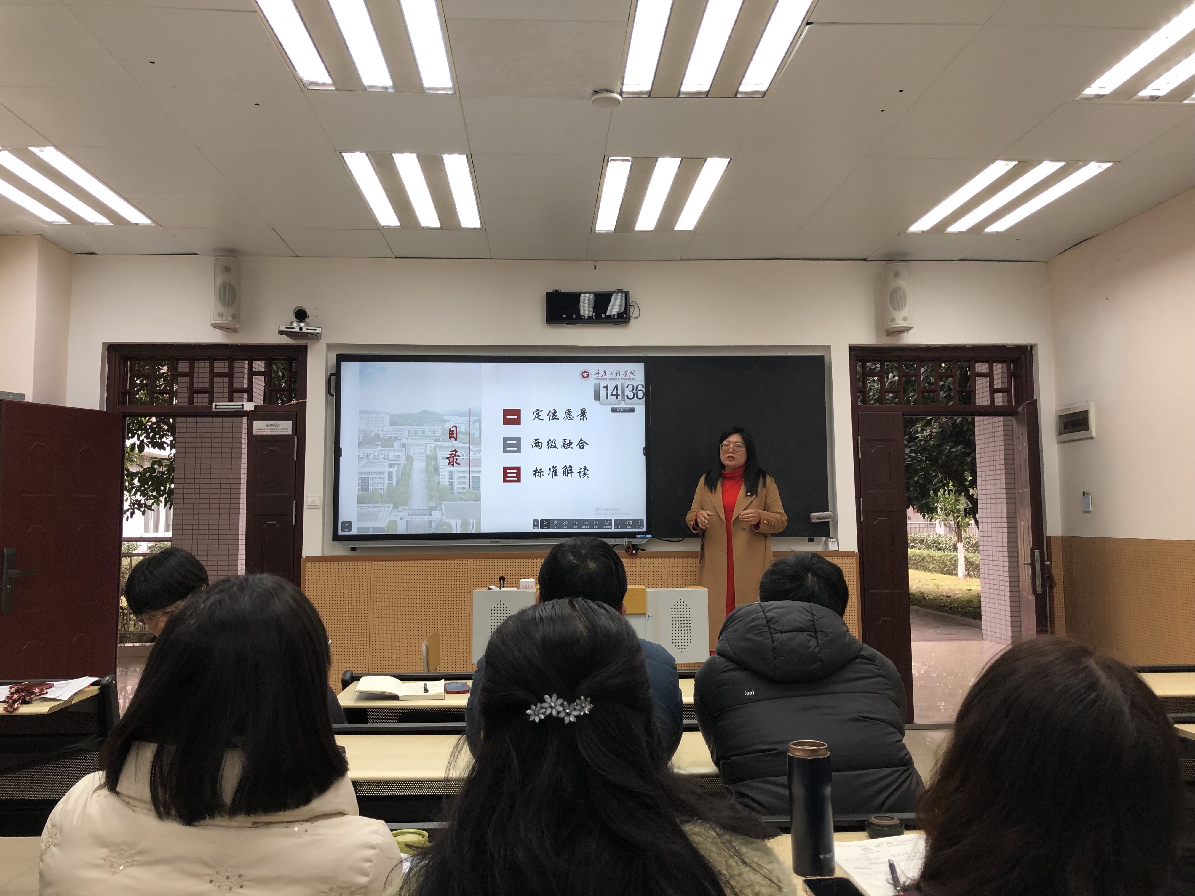 活动开始,杨剑利明确校督导组的职责是持续进行课堂教学质量监控,通过随堂听课、智慧教学在线听课的方式,从教师课堂教学、学生课堂学习、教学环境三方面采集数据并开展教学督导。她重点解读了校级督导对课程“两性一度”建设的评价标准,强调课程思政要重点挖掘并无声融入课堂,并与老师们分享了利用智慧教学设备、智学重工平台开展OBE理念的教学创新、教学设计、教学评价的课堂教学经验。