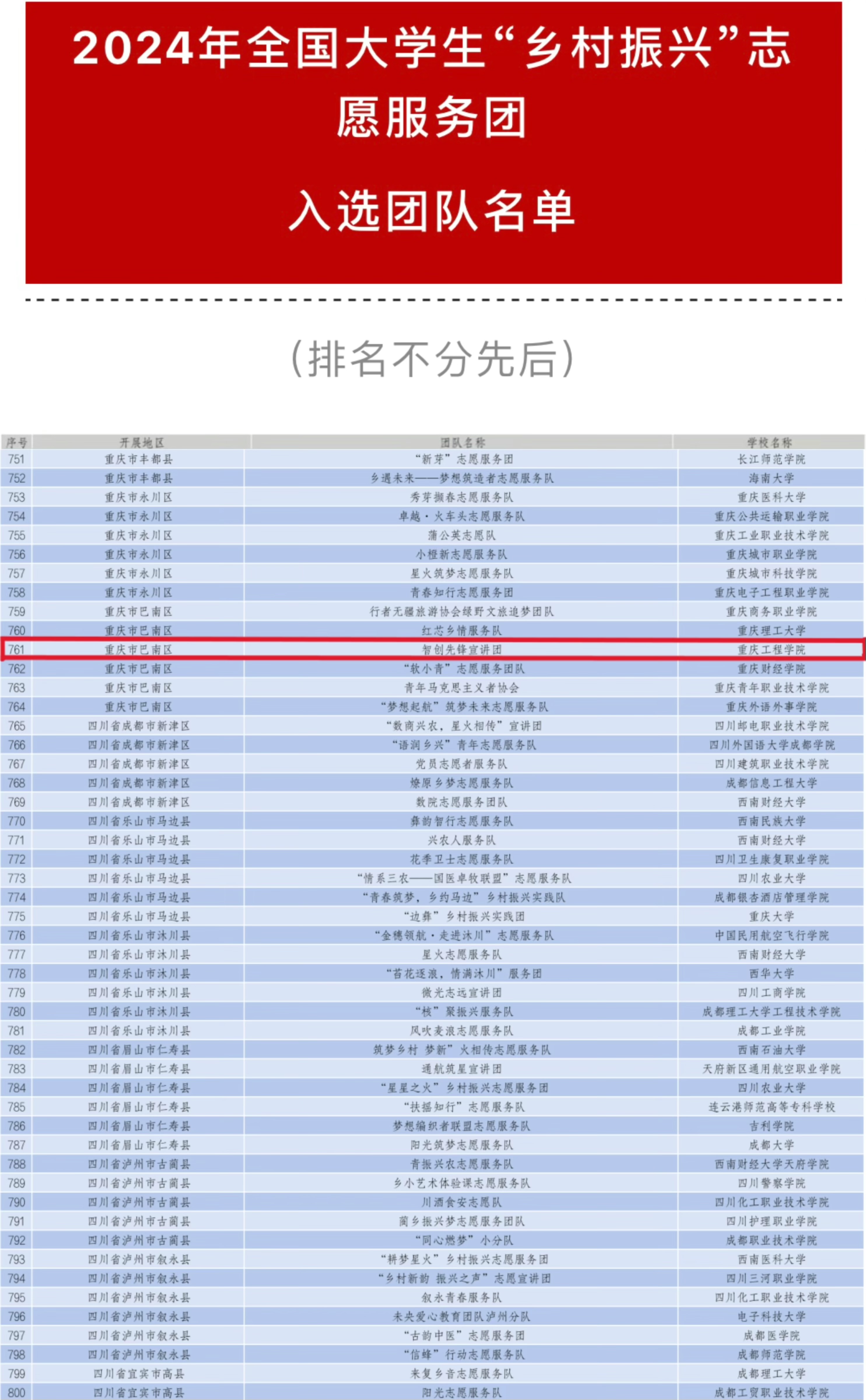 5月28日,2024年全国大学生“乡村振兴”志愿服务团入选团队名单公布,重庆工程学院智创先锋宣讲团成功入选。
