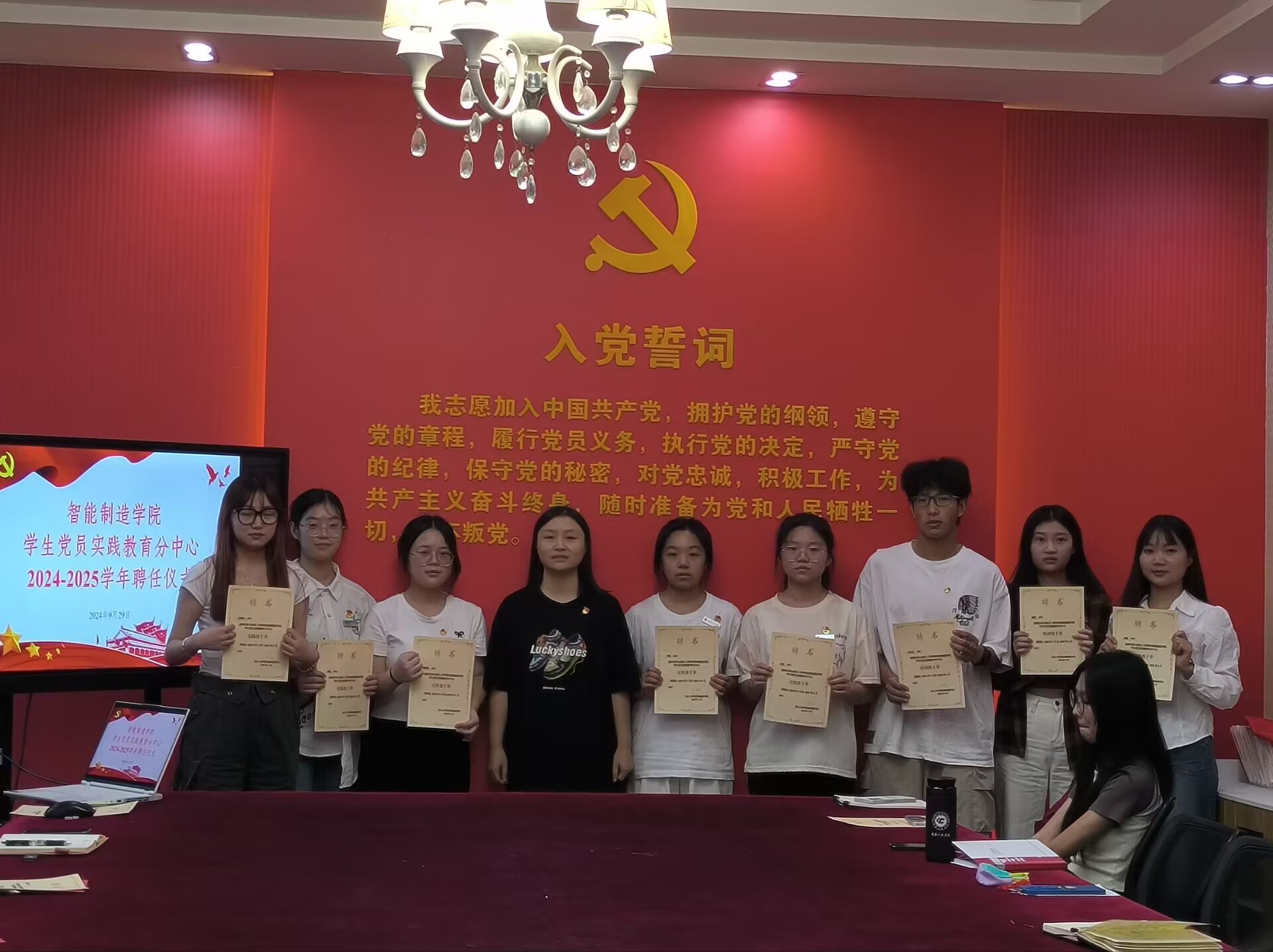 为增强团队凝聚力和向心力,提升服务质量和效率,智能制造学院学生党员实践教育中心于9月29日在办公楼举行2024-2025学年聘任仪式。智能制造学院党总支书记谭思宇、组织委员荣菁菁,学生党支部书记谢燕及中心全体成员参加本次仪式。