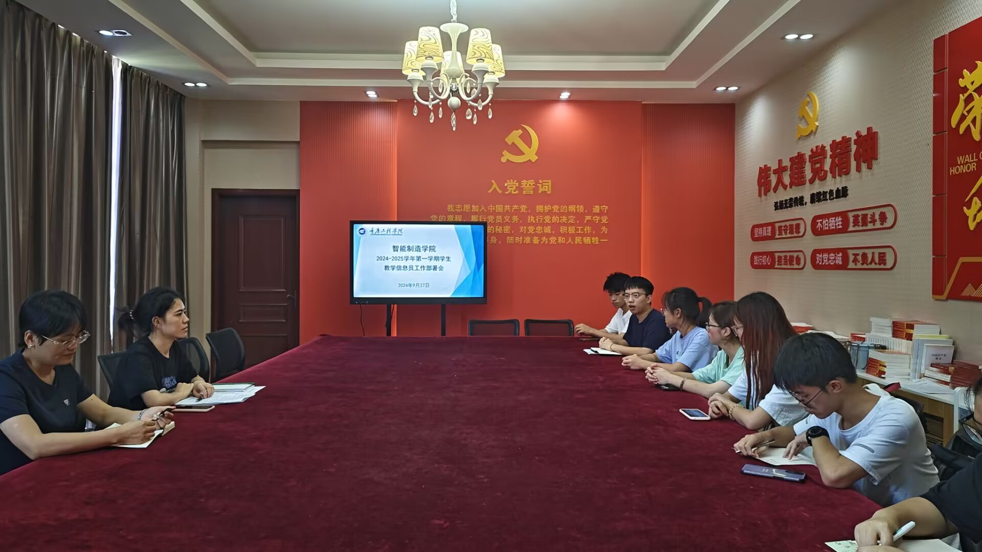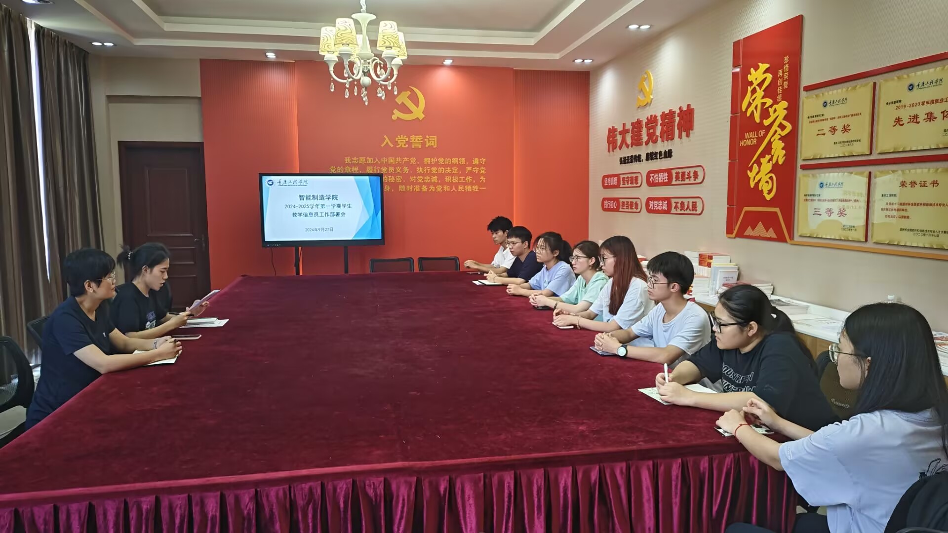 为进一步加强教学管理,提高教学质量,充分发挥学生教学信息员在教学质量监控和评价体系中的重要作用,智能制造学院于9月27日在办公楼二楼党员活动室召开期初教学信息员工作部署会。出席本次会议的有学院院长助理胡聪娟、教学秘书陈白银霜以及2022级、2023级自动化、机器人工程专业班级全体学生信息员。