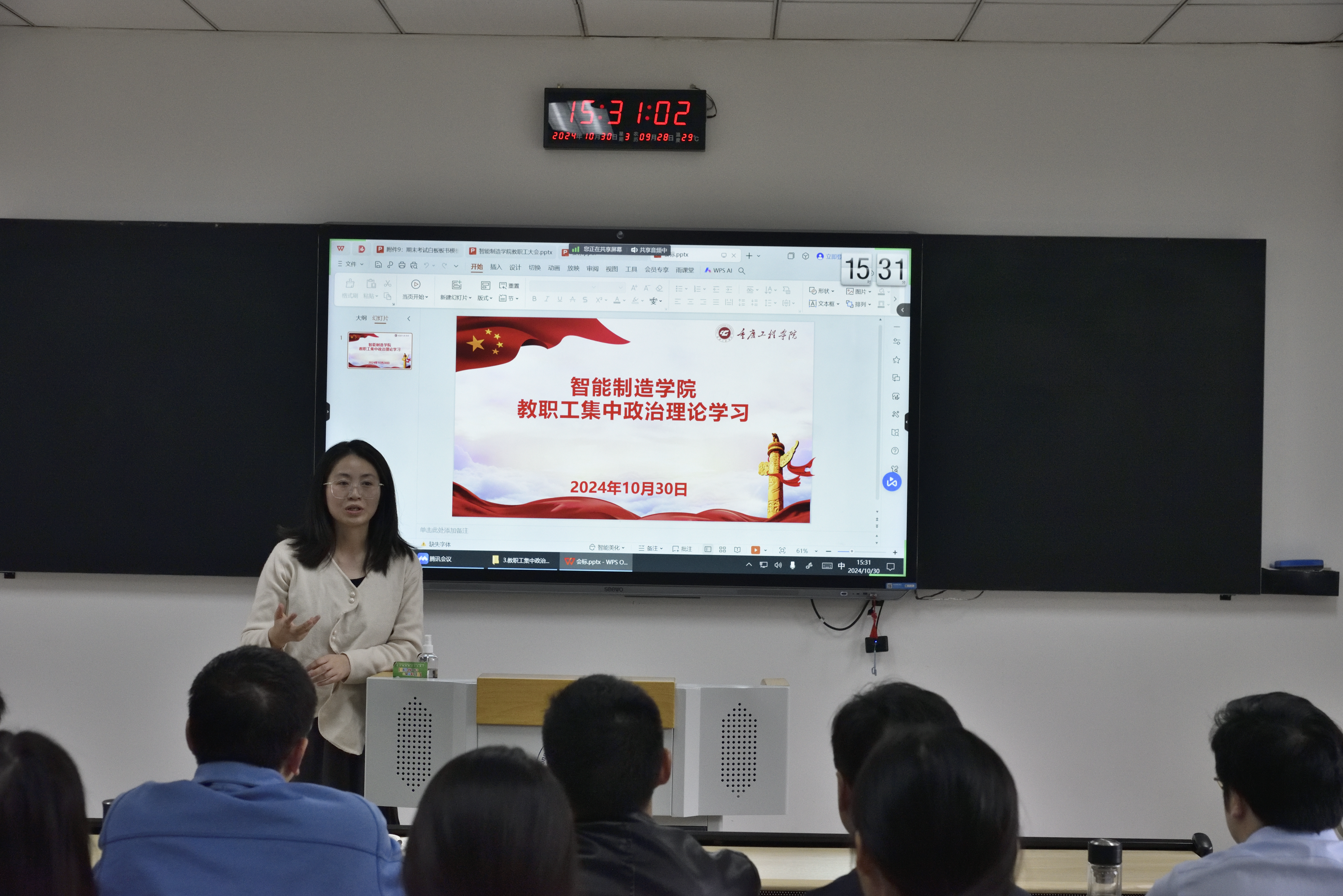 10月30日,智能制造学院党总支在第六教学楼开展教职工集中政治理论学习,学院全体院领导、教职工参会。本次学习由学院党总支组织委员荣菁菁主持。