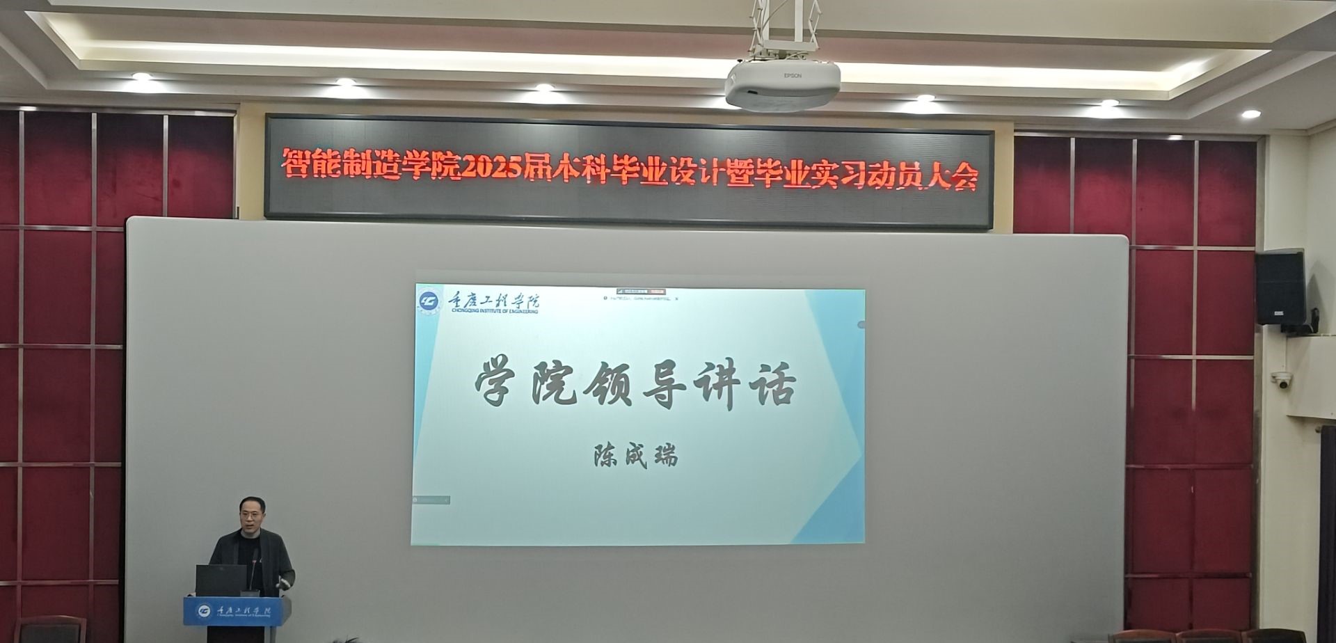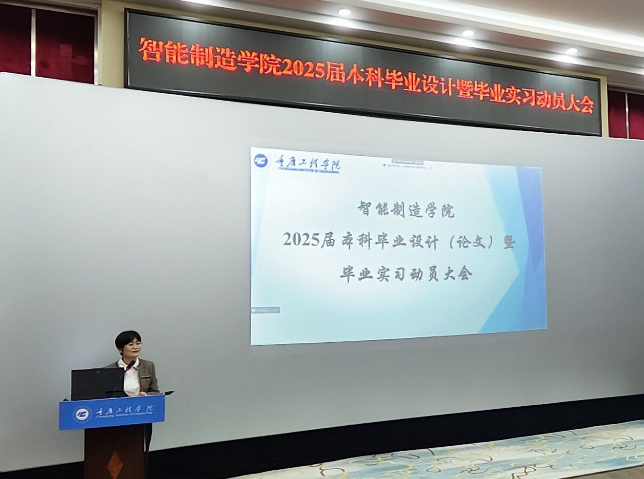 为确保2025届本科毕业设计(论文)及毕业实习工作顺利、有序开展,提高实践教学质量,10月30日,智能制造学院在办公楼报告厅组织召开2025届本科毕业设计(论文)暨毕业实习动员大会。本次会议由学院院长助理胡聪娟主持,副院长陈成瑞、自动化系副主任蒋云国、智能制造系副主任李洲荣、教学秘书陈白银霜、全体专任教师以及2025届全体毕业生参加。