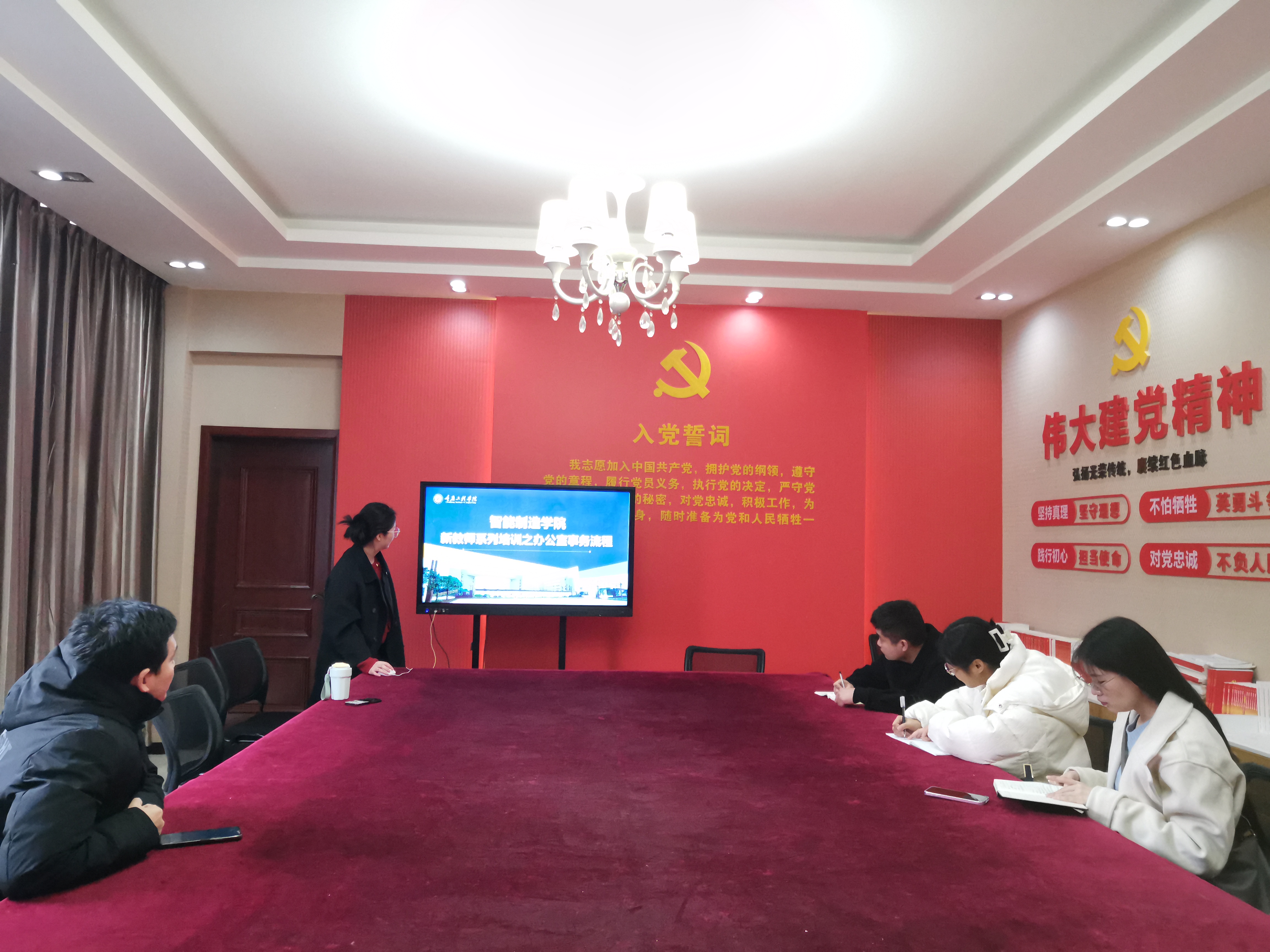 为助力新入职教师快速适应工作环境,提升行政办公效率,2024年10月23日下午14:00,智能制造学院在办公楼党员活动室组织召开了新教师培训之办公室事务流程梳理,会议由办公室主任荣菁菁主持,教学秘书陈白银霜以及全体新教师参加。