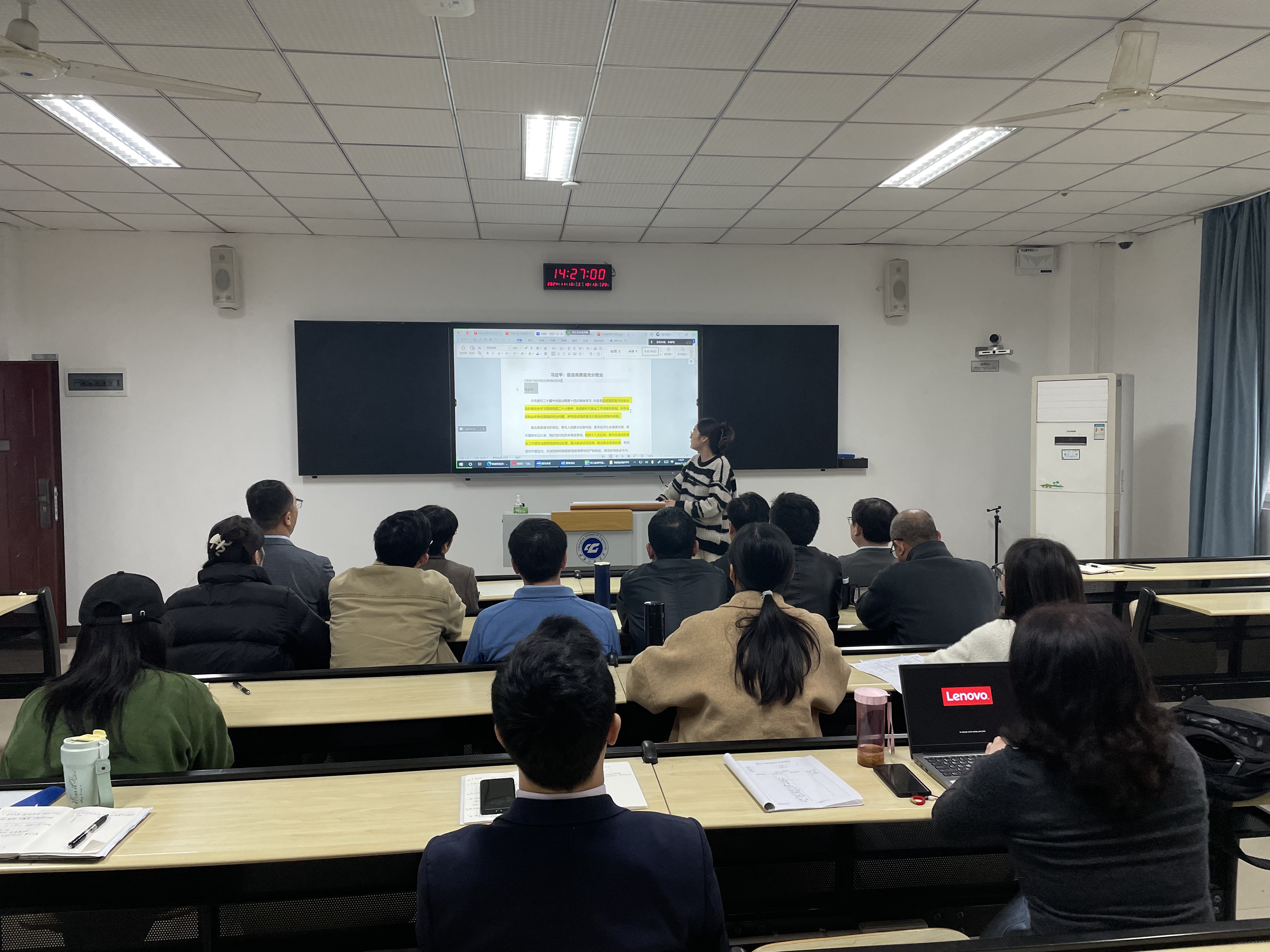 全体教师围绕习近平总书记5月27日在二十届中央政治局第十四次集体学习时讲话的主要部分,进行了学习。习近平总书记指出:“就业是家事,更是国事。”要加快建构中国就业理论体系,积极讲好中国就业故事,有效提升我国在就业领域的国际话语权和影响力。老师们纷纷表示,将全面贯彻落实习近平总书记在二十届中央政治局第十四次集体学习时的重要讲话精神,总结经验、分析情况,研究促进高质量充分就业的思路和方法。