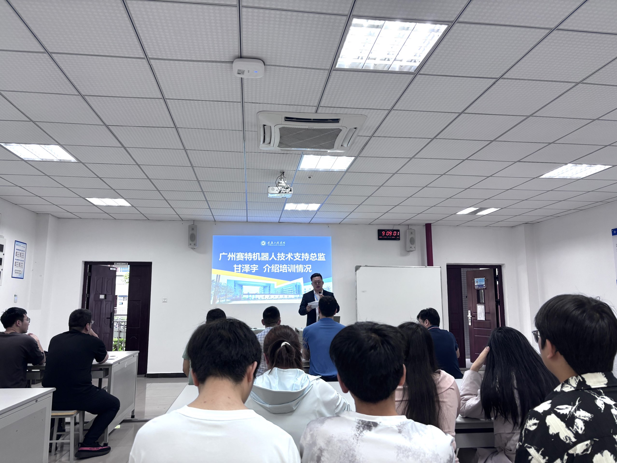 开班仪式上,陈成瑞副院长在致辞中强调,学员需以刻苦钻研的态度投入学习,充分利用校企联合培养的实践资源,全面提升工程应用能力和职业素养。广州赛特智能科技公司技术支持总监甘泽宇详细解读了订单班的培养目标,系统介绍了涵盖机器人远程运维核心技术的课程体系,并分析了行业人才需求趋势与职业发展前景。随后陈成瑞副院长宣布培训班正式启动,校企双方将协同推进教学实施,确保人才培养与产业技术发展同频共振。