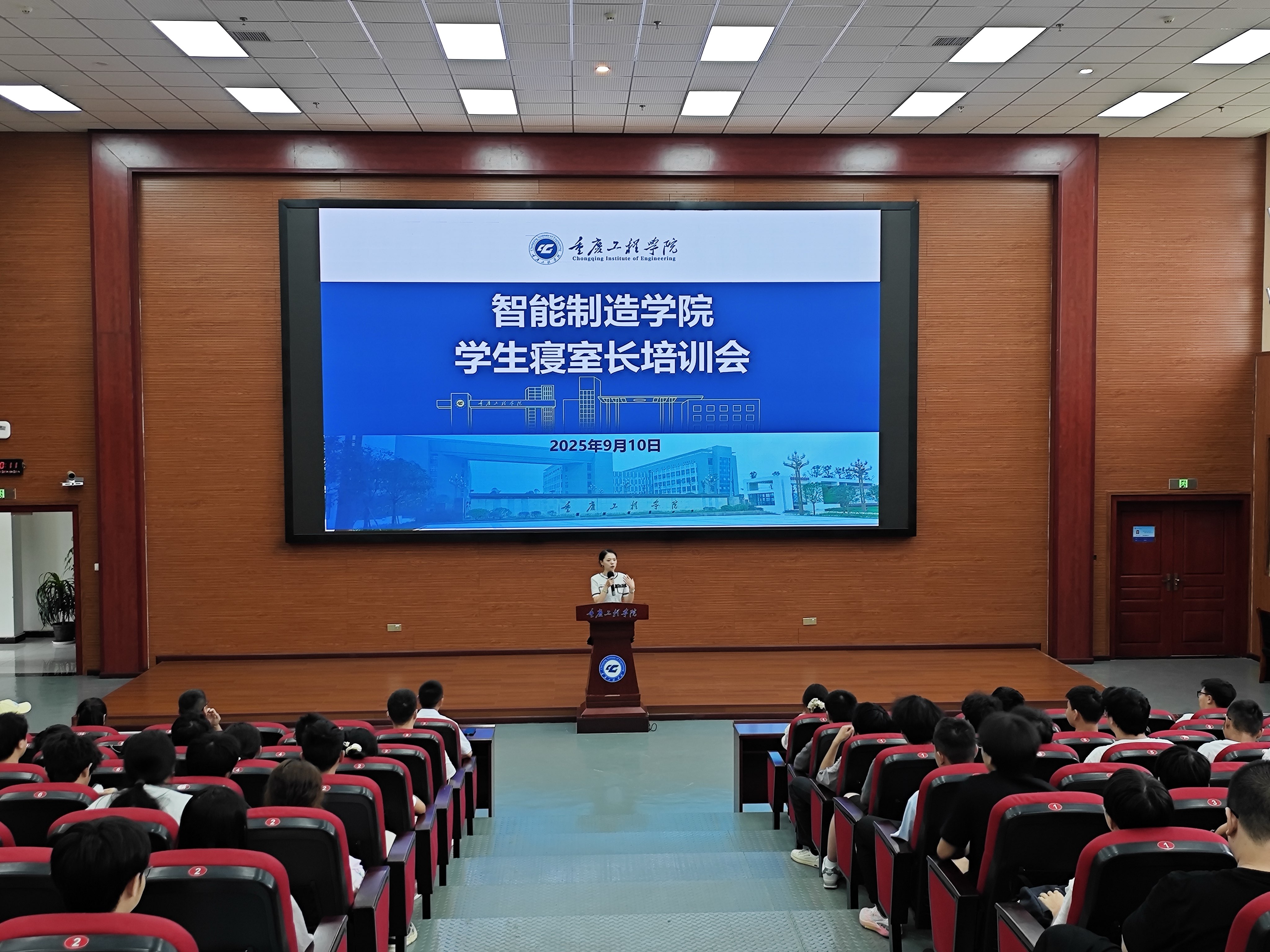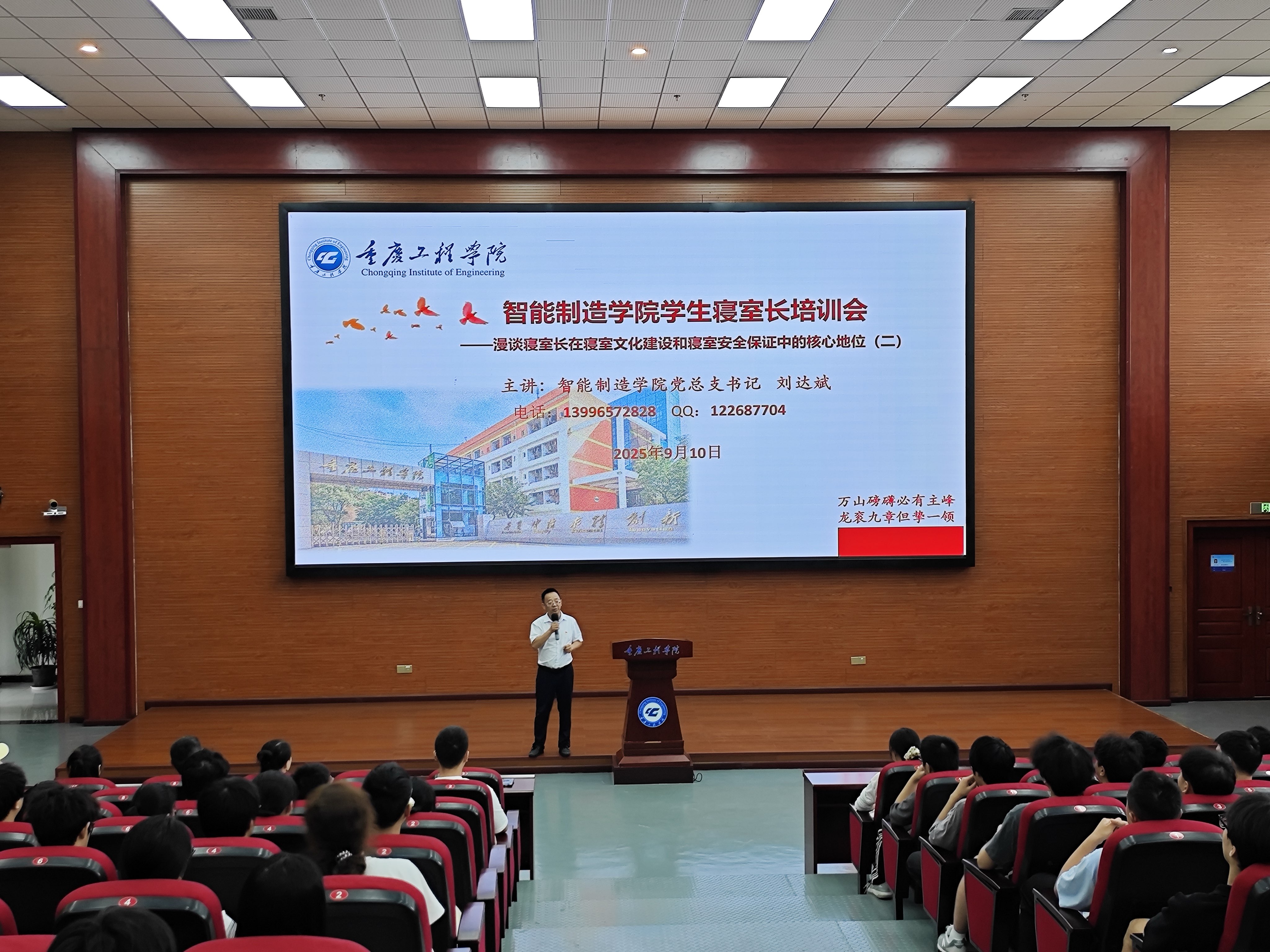 为进一步筑牢校园安全防线、浓厚寝室文化氛围,充分发挥寝室长在学生管理中的骨干桥梁作用,2025年9月10日中午,智能制造学院南泉校区160多位学生寝室长及全体辅导员在7807会议室参加寝室长专题培训会,学院党总支书记刘达斌主讲,学生科副科长李小凤主持。
