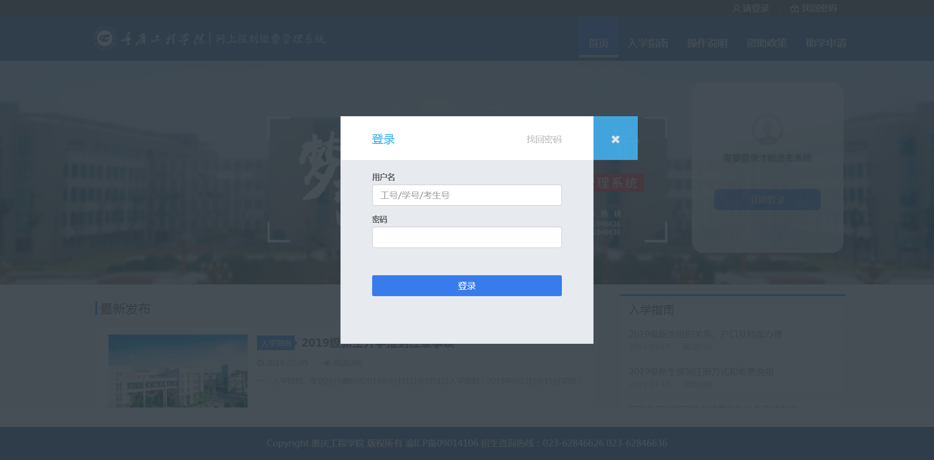 1.打开“重庆工程学院报到缴费管理系统”后,点击“立即登录”按钮。弹出登录页面。
