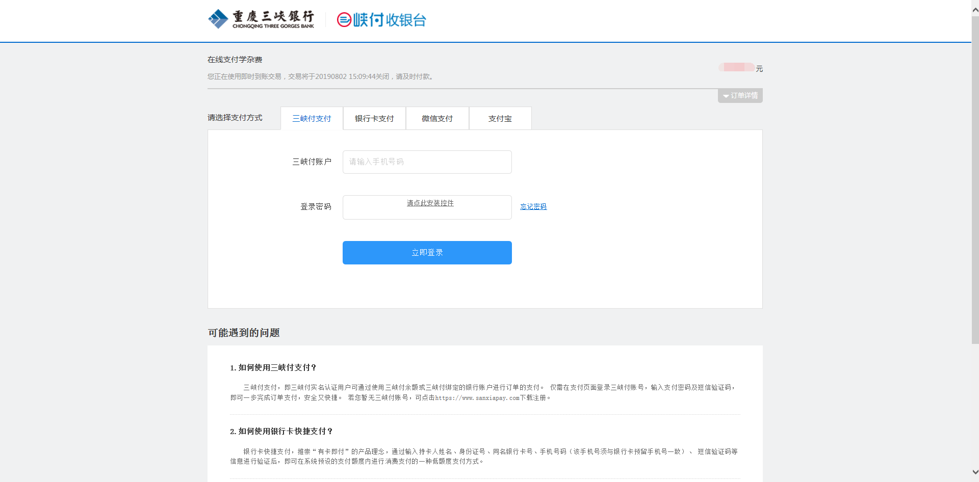 答:网上缴学费目前支持三峡付支付、微信支付、支付宝支付、银行卡支付。