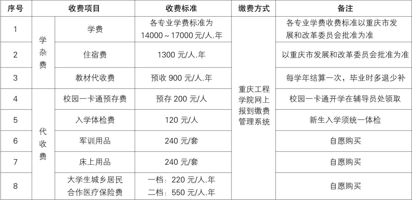 费用说明: 1.校园一卡通预存费:为方便新生开学报到后在校正常生活和学习,学校为每个新生定制了校园卡,校园卡可用于图书借阅、食堂及超市消费、寝室购电、门禁管理、学籍及助学金管理等多项功能,实现校园一卡通。学校已在每位新生的校园卡里预存了200元(免收制卡成本费),学生报到时,在辅导员处领取。校园卡预存的费用消费完后可在学校内的自助圈存机上自行充值。 2.入学体检费:根据重庆市教委的相关规定,所有新生入学报到后、学籍注册前由学校统一安排体检,入学体检费120元/人,发票在学生体检后由体检医院统一出具。 3.军训用品:新生在军训期间须统一使用军训用品。军训用品240元/套,包括衣服1套、T恤衫2件、鞋子1双、帽子1顶、皮带1根、被子1套(用于军训内务培训),凉席1床。(若新生在其他地方购买军训用品,其样式和色彩需与学校内设点的军训用品供应商提供的一致) 4.床上用品:床上用品由学校统一为新生代购,为确保质量,避免新生买到质量不被保证的“黑心”棉被,学校特引进重庆市教育委员会指定的床上用品厂家,学生自愿购买。新生宿舍统一为上床下桌设计,床的尺寸为长200cm、宽为90cm。新生床上用品可自带,也可通过“重庆工程学院网上报到缴费系统”购买,床上用品240元/套,包括被套1床、床单1床、盖絮1床(4斤)、垫絮1床(3斤)、枕芯1个、枕套1个。 5.大学生城乡居民合作医疗保险费:按照重庆市统一规定的标准执行,一档缴费标准220元/人.年;二档缴费标准550元/人.年,学生自愿选择购买缴费档次(学生在户籍当地未购买的必须购买)。 七、组织关系、户口及档案办理 1.组织关系 重庆市外新生是党员的,应在当地区(县)及以上党委组织部开具党员介绍信,介绍信抬头为“中共重庆市委教育工委”,接收单位为重庆工程学院XX学院,入学报到时将党员介绍信交学校党委组织部,由学校统一办理;重庆市内新生是党员的,应到党员组织关系所在地通过12371党建平台直接转移至中共重庆工程学院委员会XX学院党总支部学生党支部。 新生团组织关系网上转接由原高中学校团组织或本人通过“网上共青团•智慧团建”系统发起申请,转入到重庆工程学院录取对应二级学院新生临时团支部即可,例如“管理学院新生临时团支部”。 团组织关系纸质材料和新生个人档案开学报到后统一交至辅导员处。 2.户口档案关系 根据重庆市公安局户籍管理办法,新生户籍地属重庆市主城区的一律不迁移;属非主城区或者市外的可以不迁移,若需迁移到学校集体户口,需凭《录取通知书》到入学前户籍所在地公安机关开具户口迁移证明(户口迁往地址为:重庆市巴南区南泉街道白鹤林16号),待入学报到时交由班级辅导员处,报到后一周内,由学校保卫处带领学生集中办理。 户口迁移证、居民身份证上使用的姓名必须与《录取通知书》上的姓名一致,如有出入,请报到前在当地公安机关做好更改手续。户口迁移证上须盖有当地公安机关或乡(镇)政府的户口管理专用章,出生年、月、日必须完整,如有缺项应请迁出管理机关及时补正。 3.高考纸质档案由新生直接带到学校交给辅导员或邮寄到学校。 邮寄地址:重庆市巴南区南泉街道白鹤林16号重庆工程学院招生办收,邮编:400056。 八、国家生源地信用助学贷款及助学金手续办理 家庭经济困难新生请如实填写《家庭经济困难学生认定申请表》,入学报到时交学校,作为进校后申请勤工助学岗位及国家助学金参考依据之一。同时,家庭经济困难的新生可凭《录取通知书》和《家庭经济困难学生认定申请表》到当地区县教委(教育局)大学生资助中心办理国家生源地信用助学贷款。 九、学校新生助学金申请 学校专门设立有新生助学金,帮助经济特别困难且品学兼优新生顺利完成学业。其中,一档助学金为10000元/生;二档助学金8000元/生;三档助学金5000元/生;四档助学金3000元/生。新生填写好《重庆工程学院新生助学金申请表》(附件1)并将相关贫困证明材料(复印件)一起邮寄到学校招生办参加评审,学校评审出符合颁发新生助学金条件的新生给予助学金发放。(具体申请评定流程详见入学指南内“重庆工程学院新生助学金申请及评定办法”) 新生助学金申请表及相关证明材料邮寄地址:重庆市巴南区南泉街道白鹤林16号重庆工程学院招生办收,023-62846626,邮编:400056。收件截至时间为2020年9月20日。 十、普通高等教育招生信息告知书签字确认 根据中共重庆市委教育工作委员会、重庆市教育委员会、重庆市监察局联合下发的《重庆市规范高等教育招生秩序严肃高等教育招生纪律若干规定》(渝教招考〔2012〕8号)文件精神,将我校2020年普通高等教育招生信息以书面形式公开并告知各位新生及家长,详见《重庆工程学院2020年普通高等教育招生信息告知书》(附件2),请新生及家长阅读知晓后签字确认,新生报到时须将签字确认后的告知书交于学校。(注:此告知书一式贰份,新生及家长留存一份,另一份返学校)。 学校招生办咨询电话:023-62846626 62846636