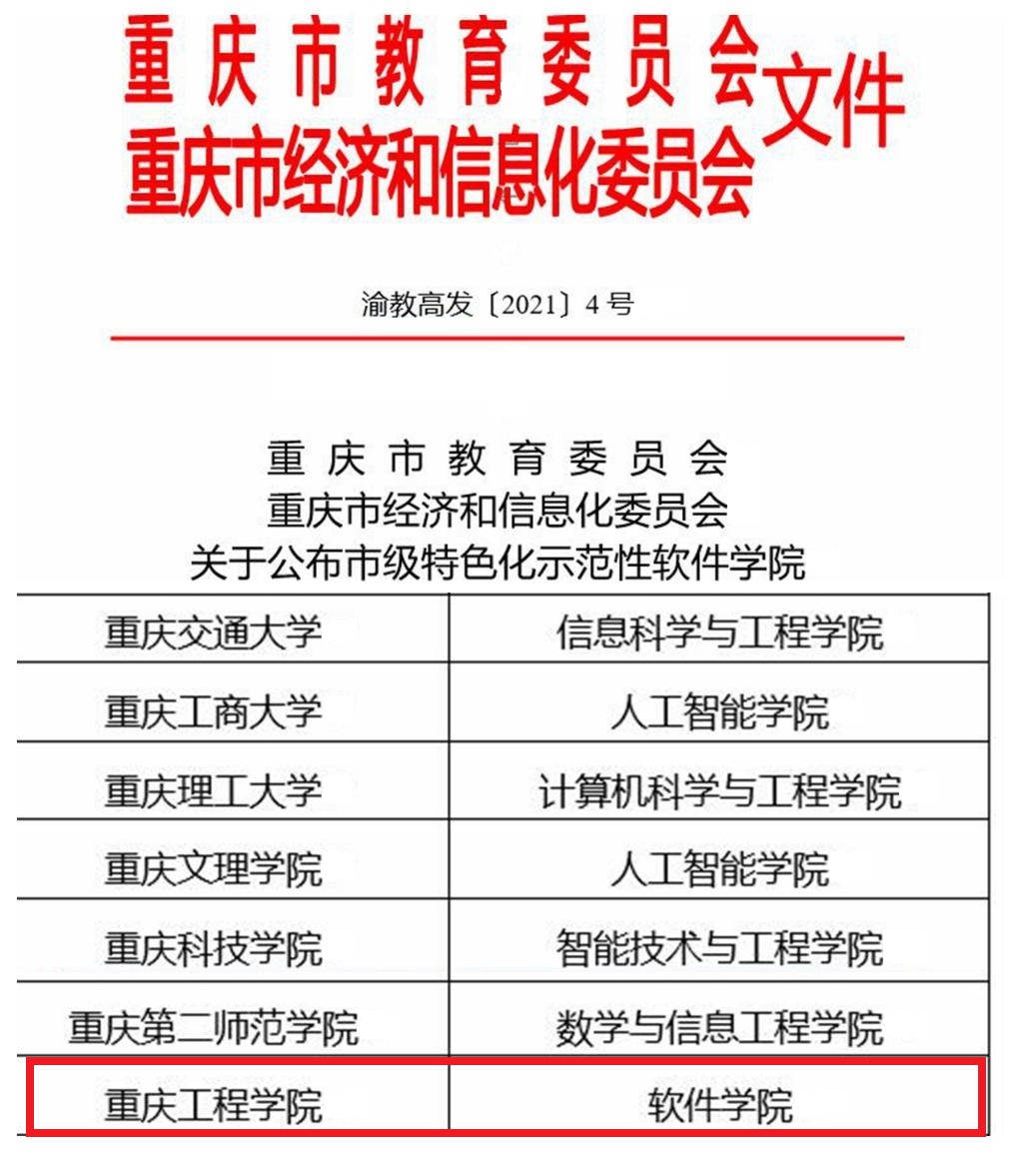 近日,重庆市教育委员会发布《重庆市特色化示范性软件学院评选结果公示》,我校软件学院位列其中,成为重庆市特色化示范性软件学院建设高校。