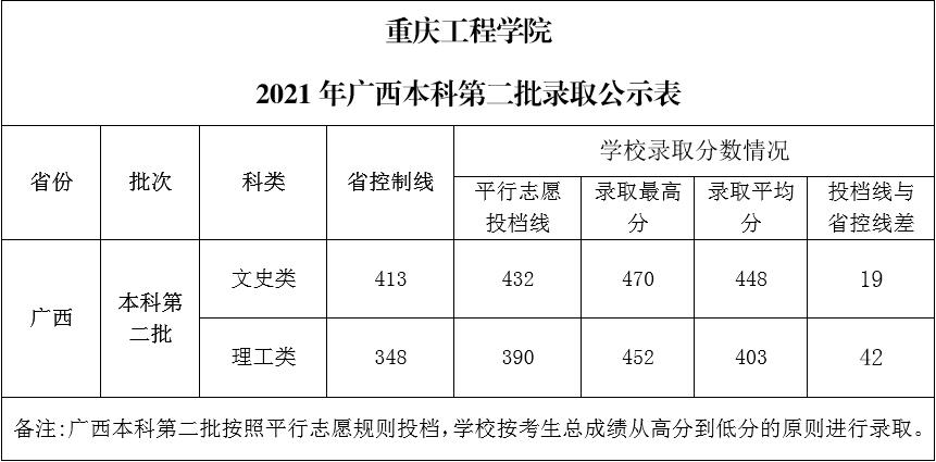 根据广西2021年普通高校招生录取进程,我校已完成了广西本科第二批(文理类)的录取工作,招生计划已录取满额,考生可以登录广西招生考试院网站(www.gxeea.cn)或学校阳光招生网(http://42.247.25.91:8088)查询录取轨迹及录取信息,新生录取通知书将于8月2日后采用中国邮政特快专递(EMS)的形式寄出,请录取的考生在近期保持手机的畅通并注意查收。如有疑问,请致电重庆工程学院招生办公室,联系电话:023-62846626、62846636。