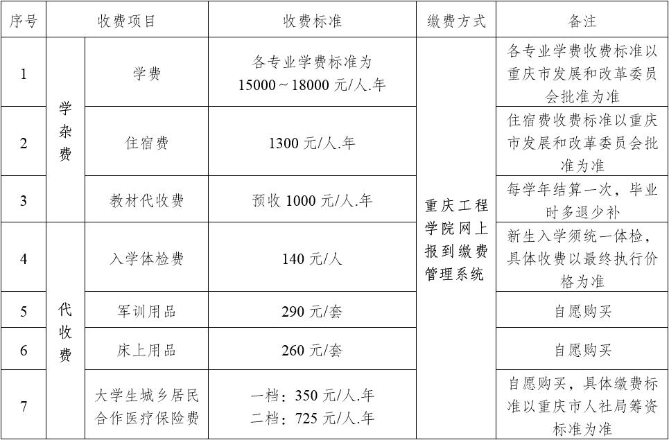 1.入学体检费:根据重庆市教委的相关规定,所有新生入学报到后、学籍注册前由学校统一安排体检,入学体检费140元/人,具体收费以最终执行价格为准。