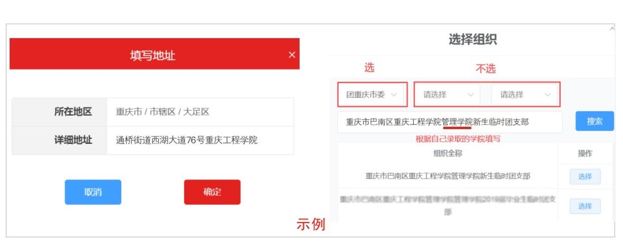 注:在“新学校所在地详细地址”是填大一新生就读的大足双桥校区的地址,而“申请转入组织”需要填写学校巴南南泉校区相关二级学院信息。智慧团建系统内具体选择学校区域时只选择第一个“团重庆市委”,后面两个均不用选择,下方组织全称搜索时需输入学校完整信息,如“重庆市巴南区重庆工程学院XX学院新生临时团支部”。