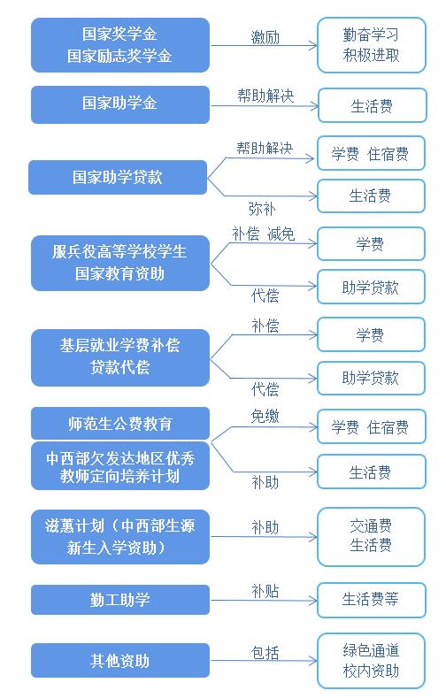 1.国家奖学金 奖励纳入全国招生计划内的特别优秀的全日制本专科(含高职、第二学士学位)在校生,每年奖励6万名,每生每年8000元,颁发国家统一印制的荣誉证书。 2.国家励志奖学金 奖励纳入全国招生计划内的品学兼优的家庭经济困难全日制本专科(含高职、第二学士学位)在校生,每生每年5000元。 3.国家助学金 资助纳入全国招生计划内的家庭经济困难全日制本专科生(含预科、高职、第二学士学位学生,不含退役士兵学生),平均资助标准为每生每年3300元,具体标准由高校在每生每年2000—4500元范围内自主确定,可以分为2—3档。全日制在校退役士兵学生全部享受本专科生国家助学金,资助标准为每生每年3300元。 4.国家助学贷款 国家助学贷款是由政府主导,金融机构向高校家庭经济困难学生提供的信用贷款,优先用于支付在校期间学费和住宿费,超出部分可用于弥补日常生活费,每人每年最高不超过12000元,在校期间利息由国家承担。助学贷款期限为学制加15年,最长不超过22年。助学贷款利率按照同期同档次贷款市场报价利率(LPR)减30个基点执行。国家助学贷款分为生源地信用助学贷款和校园地国家助学贷款,有贷款需求的学生可向户籍所在县(市、区、旗)的学生资助管理部门咨询办理生源地信用助学贷款,或向就读高校学生资助管理部门咨询办理校园地国家助学贷款。借款学生同一学年内不能同时申请生源地信用助学贷款和校园地国家助学贷款。 5.服兵役高等学校学生国家教育资助 对应征入伍服义务兵役、招收为军士(原士官)的高校学生,在入伍时对其在校期间缴纳的学费实行一次性补偿或用于学费的国家助学贷款实行代偿;对应征入伍服兵役前正在高等学校就读的学生(含按国家招生规定录取的高校新生),服役期间按国家有关规定保留学籍或入学资格、退役后自愿复学或入学的,实行学费减免;对退役后,自主就业,通过全国统一高考或高职分类招考方式考入高等学校并到校报到的入学新生,实行学费减免。学费补偿或国家助学贷款代偿金额,按学生实际缴纳的学费或用于学费的国家助学贷款(包括本金及其全部偿还之前产生的利息)两者金额较高者执行;复学或新生入学后学费减免金额,按高等学校实际收取学费金额执行。学费补偿、国家助学贷款代偿以及学费减免的标准,每生每年最高不超过12000元,超出标准部分不予补偿、代偿或减免。 6.基层就业学费补偿贷款代偿 中央高校应届毕业生,自愿到中西部地区、艰苦边远地区和老工业基地县以下(不含县级)基层单位就业、服务期在3年以上(含3年)的,补偿学费或代偿用于学费的国家助学贷款(包括本金及其全部偿还之前产生的利息),每生每年不超过12000元。地方高校毕业生学费补偿贷款代偿由各地参照中央政策制定执行。 7.师范生公费教育