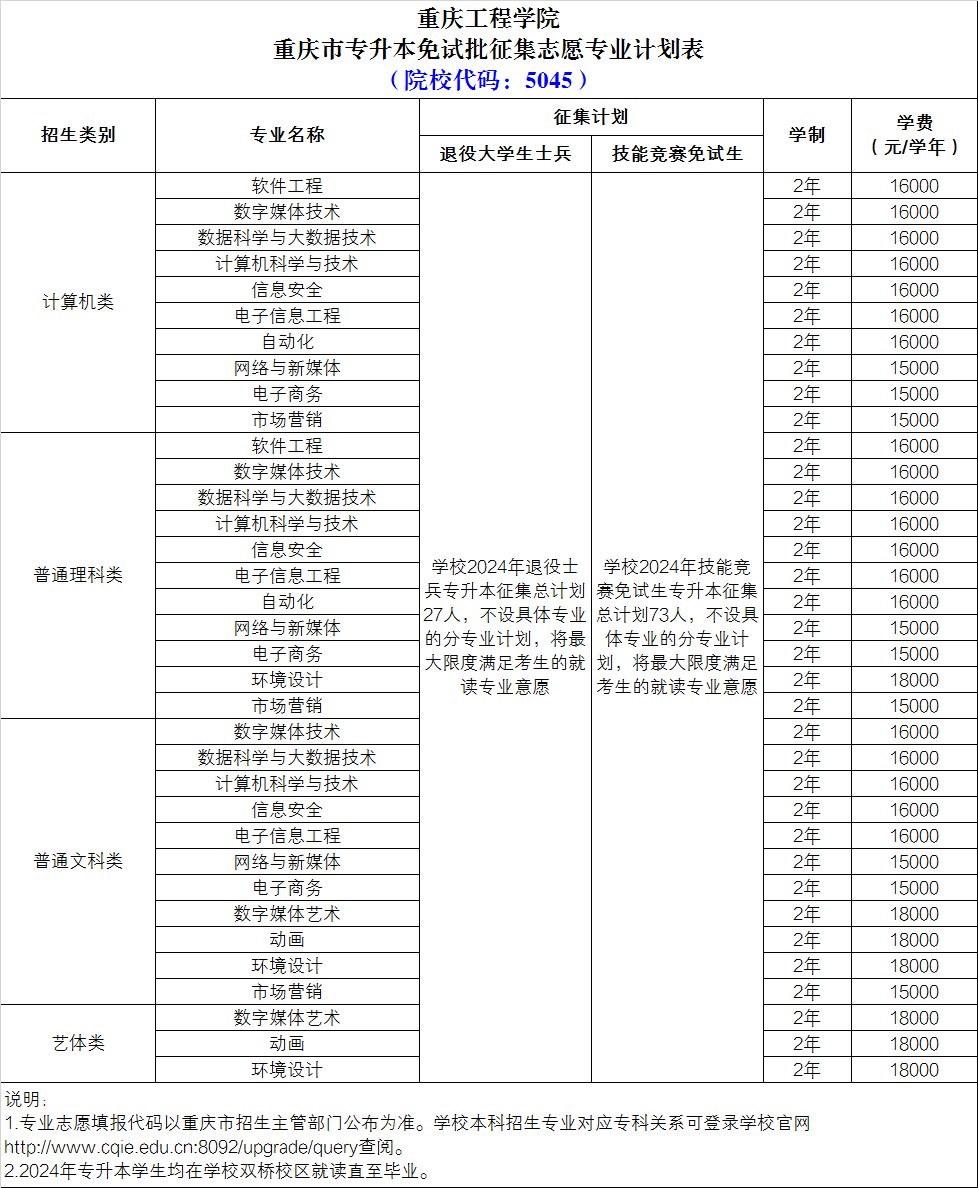 二:招生对象:未被任何高校录取的退役大学生士兵和技能竞赛免试生均可填报我校,考生须按照我校公布的本专科专业对应关系等进行志愿填报(学校专升本查询系统http://www.cqie.edu.cn:8092/upgrade/query)。