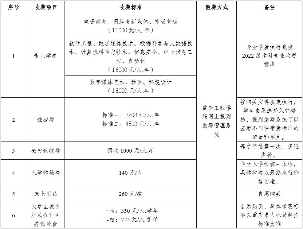 2.床上用品:学校公寓统一为上床下桌设计,标准一的床长宽大小为:2.0米*0.9米;标准二的床大小为:2.0*1.0米。学生床上用品可自带,也可自愿通过“重庆工程学院网上报到缴费管理系统”缴纳床上用品费后到学校领取所购床上用品。为确保质量,避免学生买到无质量保证的“黑心”棉被,学校特引进了重庆市教育后勤协会年检合格的床上用品厂家,提供床上用品供学生选购。所提供的床上用品260元/套,包括被套1床、床单1床、盖絮1床(4斤)、垫絮1床(3斤)、枕芯1个、枕套1个。