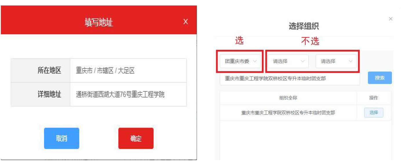 注:在“新学校所在地详细地址”填就读的大足双桥校区的地址,“申请转入组织”填写重庆工程学院双桥校区专升本临时团支部。智慧团建系统内具体选择学校区域时只选择第一个“团重庆市委”,后面两个均不用选择,下方组织全称搜索时需输入学校完整信息:重庆市重庆工程学院双桥校区专升本临时团支部。