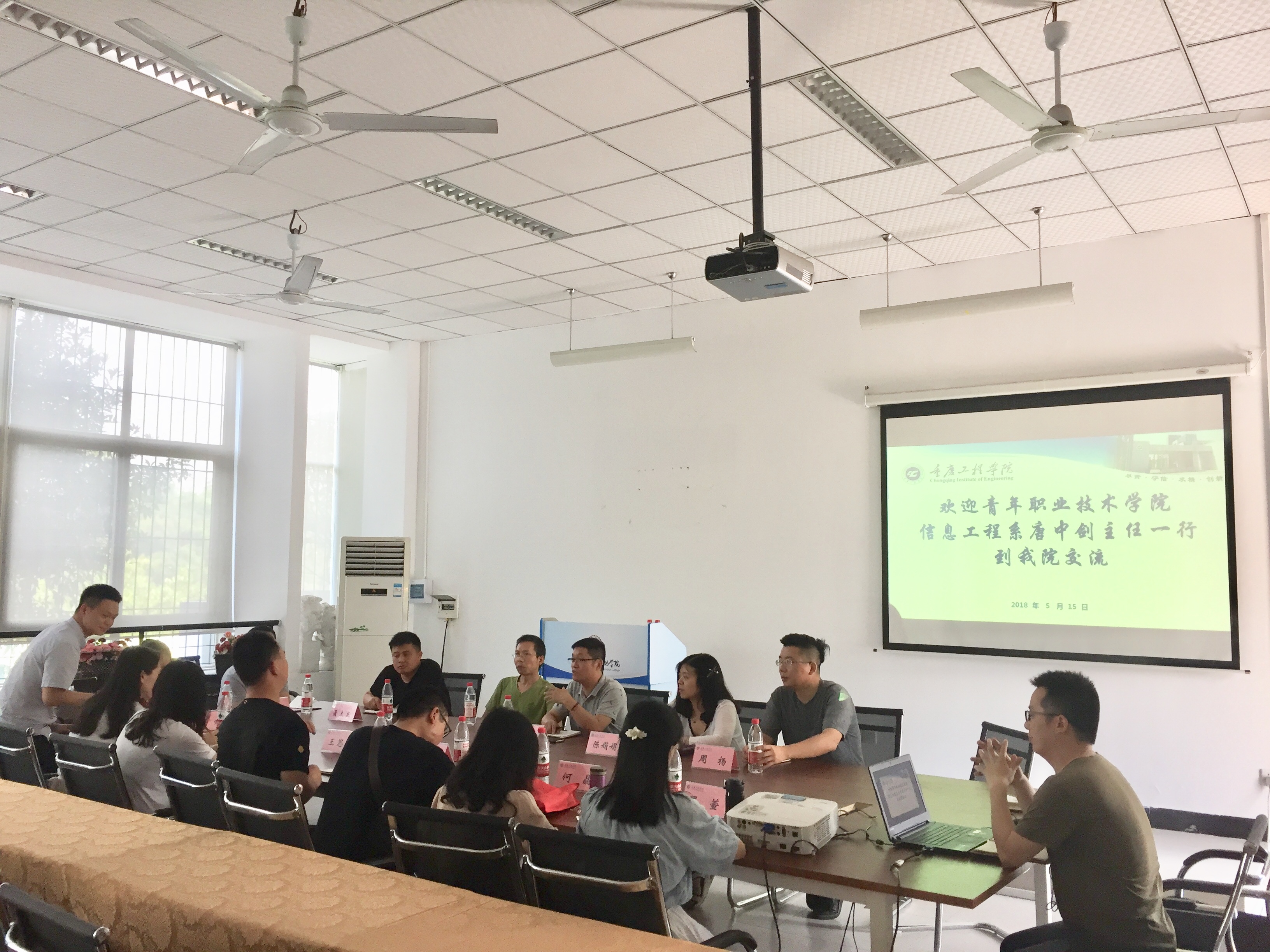 会上,庄涛文副院长首先就唐中剑主任一行表示了热烈的欢迎,其次简要介绍本学院的专业设置情况、学院教师队伍及学院系部介绍。同时,唐主任也对系部专业集群、教师队伍及在校学生情况做了简要介绍。会中,双方从课程体系建设、方向分流情况、项目制整合教学、项目来源、工作室教学模式、教师团队的培养及校企合作等多个方面进行交流。
