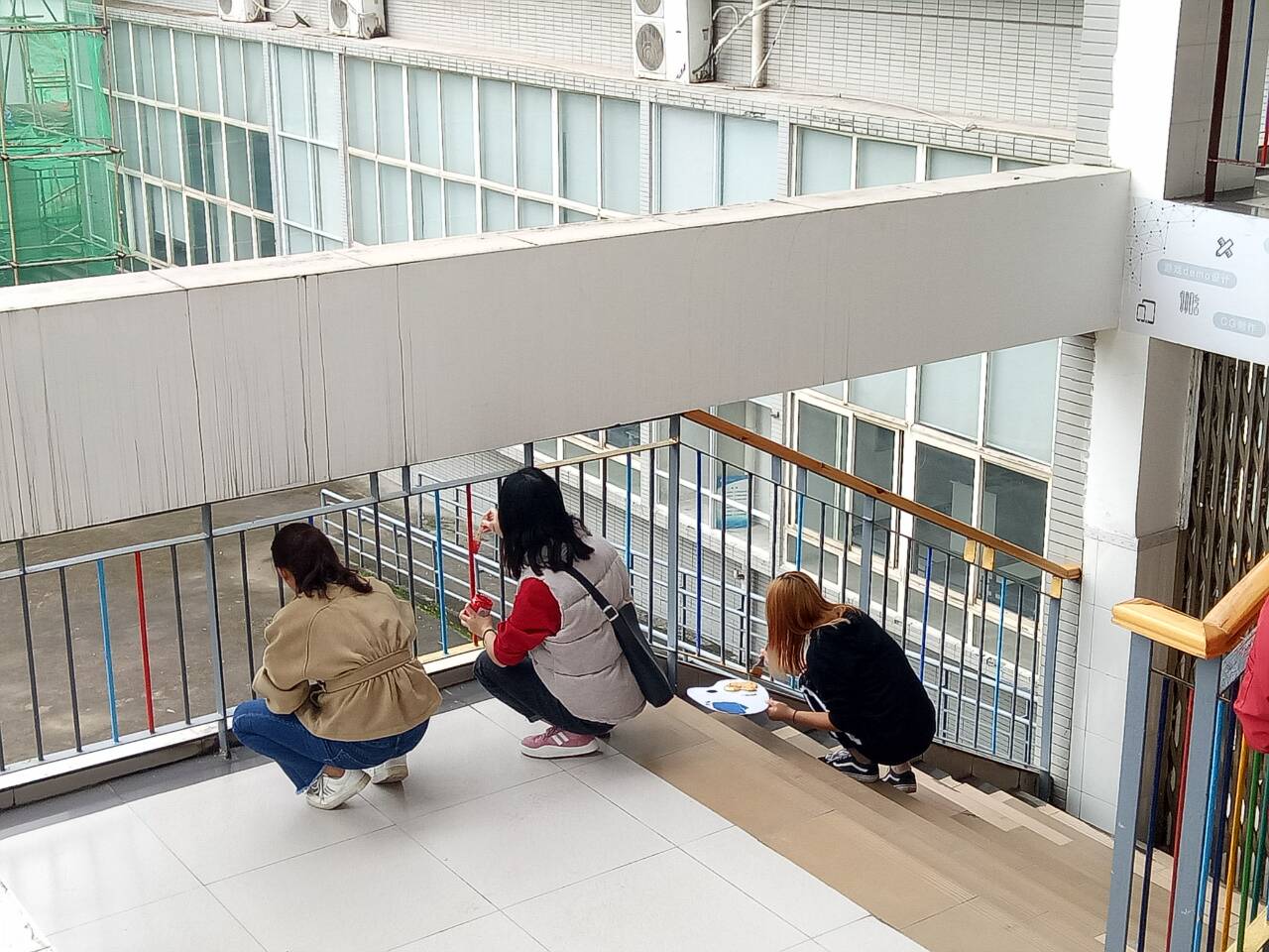学生们利用课余时间,选择在好天气的10月30日开工了。经过了前期栏杆区域划分、色彩调和、进程筹划等准备,“彩漆行动”有步骤、有计划地开展起来了。工作过程中大家齐心协力,耐心对待每一区域建筑,并加入了自己的创意,完善整体色彩搭配。