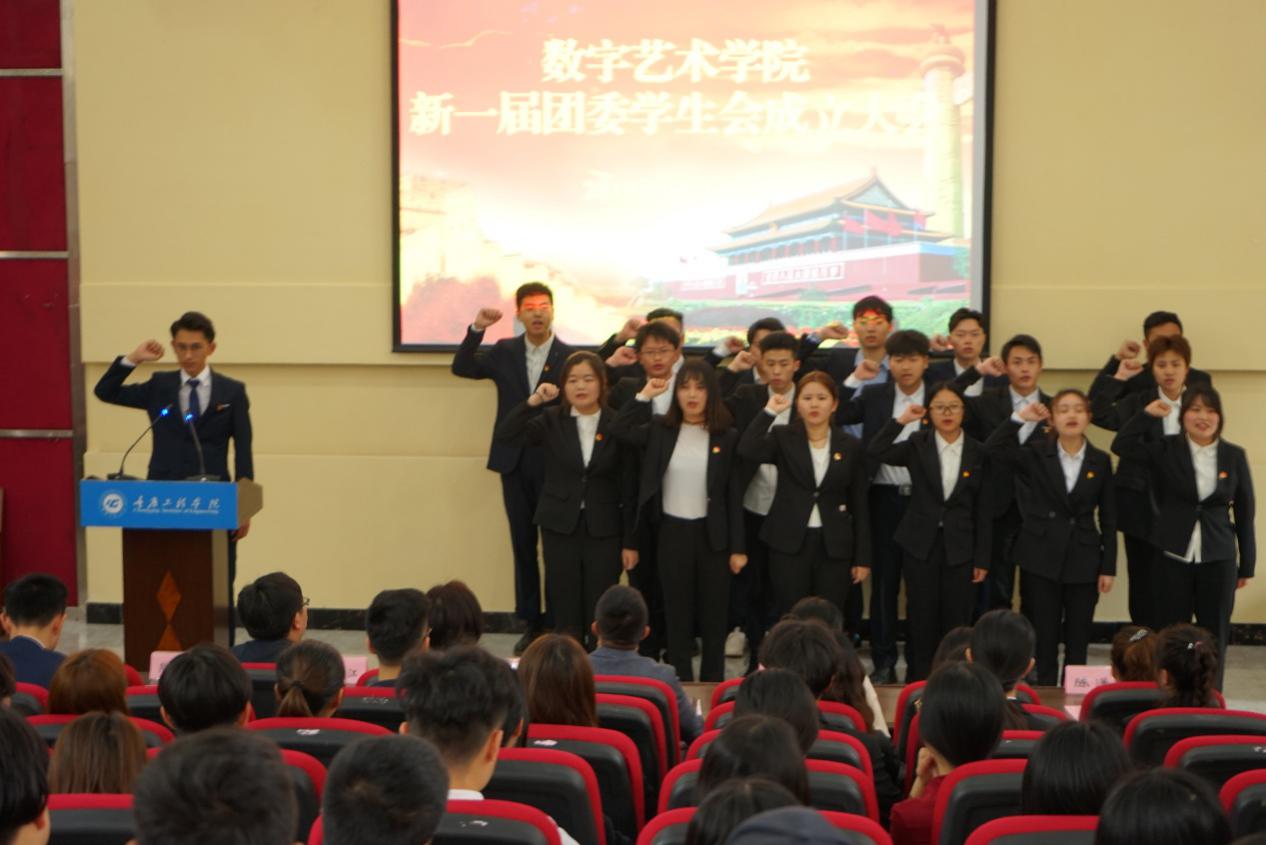 数字艺术学院党总支书记徐小辉宣读新一届团委学生会干部成员名单并宣布数字艺术学院团委学生会正式成立。上一届学生会主席朱家成和本届学生会主席杜博同学分别发表了感言。随后,新一届团委学生会全体干部宣誓,他们将“恪尽职守、率先垂范、热爱学习、踏实工作、勇于担当、乐于奉献”。