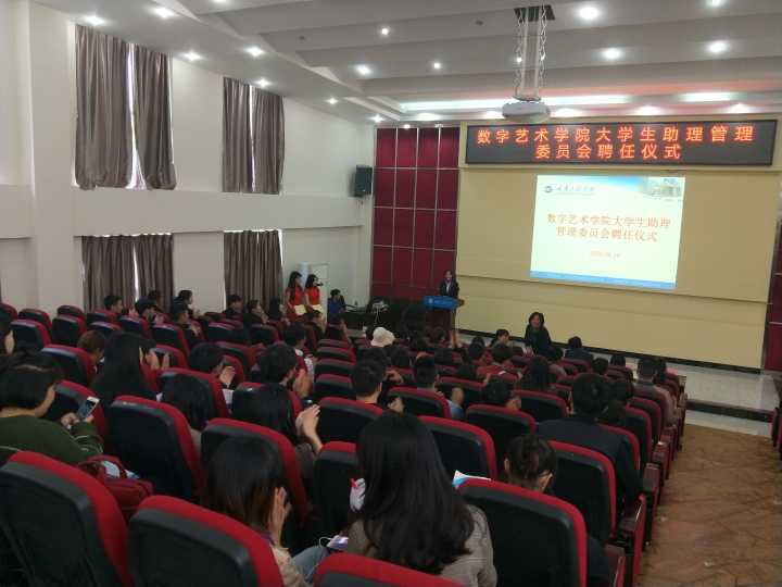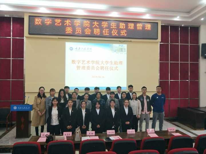 为进一步加强数字艺术学院大学生助理管理委员会组织建设,选拔人才,为大学生助理管理委员会注入新生力量,形成一支工作能力强、综合素质高的干部队伍,2019年4月16日(星期二)中午12:30,数字艺术学院在行政报告厅举办新一届大学生助理管理委员会聘任仪式。