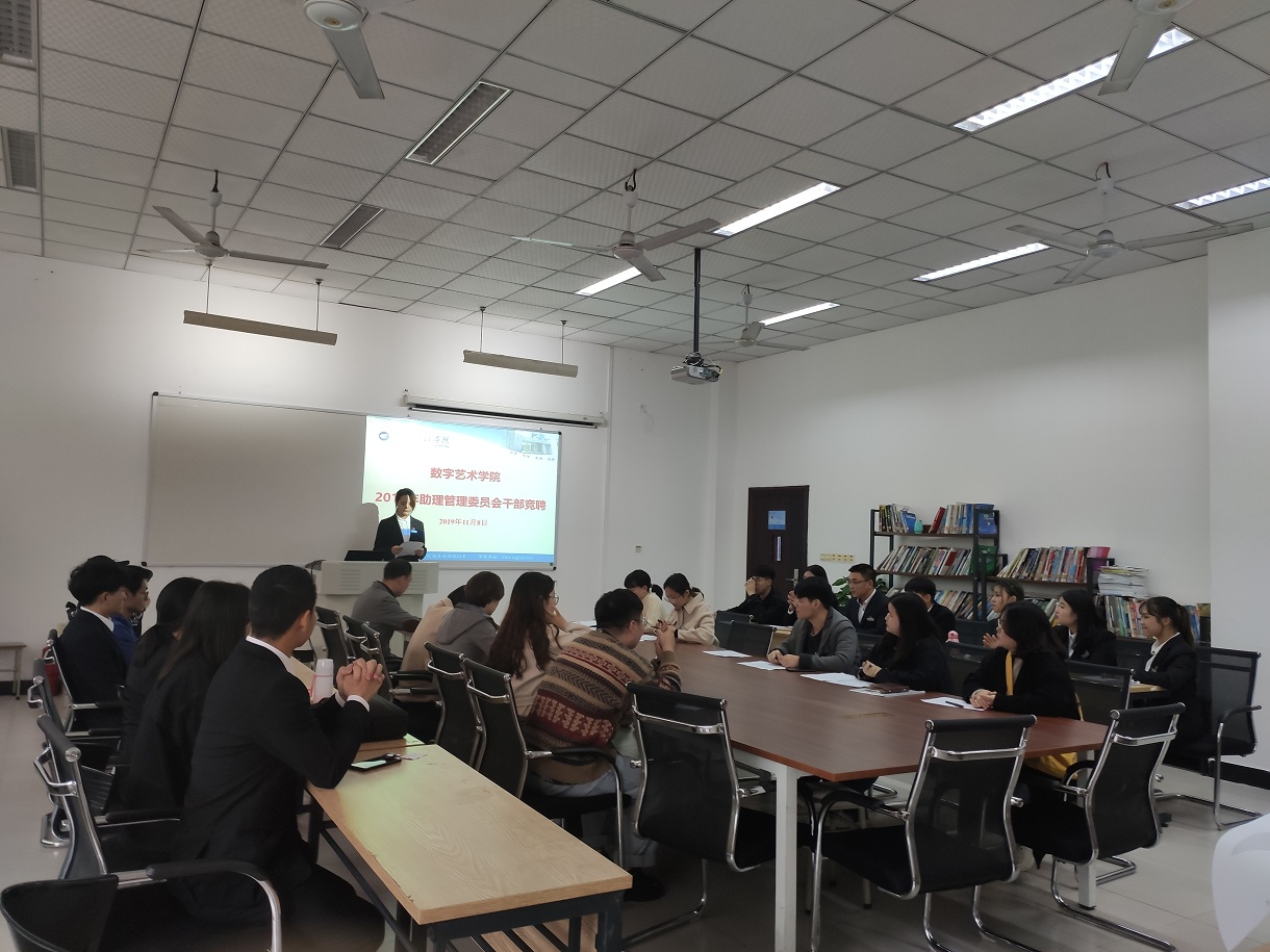 2019年11月8日中午12:30,数字艺术学院助理管理委员会在五教5207开展了新一届助理管理委员会干部岗位的竞聘工作。本次竞聘会共有12名同学参与了干部职位的竞聘,学生工作室主任周静、团委书记杨礼、辅导员代表陈遥、汪粒粒、刘念以及全体助管会的学生干部参加会议并对竞聘者进行了现场打分。