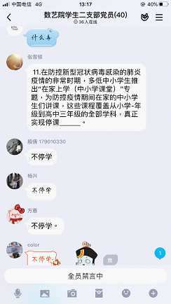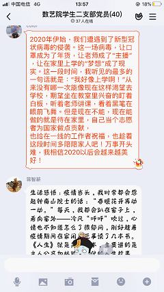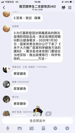 由于目前正处于新冠病毒肺炎疫情期间,本次活动采取线上学习和文字交流的方式,在学习强国APP里学习了解关于新冠病毒肺炎疫情防控知识和近期国家重要会议精神,并利用党员QQ群进行知识竞答,同志们都踊跃抢答。随后大家在群里交流分享自己的假期生活及感悟,有谈到在疫情期间的所见所闻,也有谈到在疫情爆发时,发挥党员模范带头的作用和艰苦奋斗的精神,有的同志积极响应,配合村委进行村民的新型肺炎预防宣传工作,深入走访落实到实地。