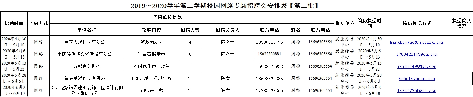 2020届应届毕业生正值就业黄金期,因疫情影响,特将线下专场招聘会活动移至线上,专场招聘会将从四月三十日起,发布四月份共重庆完美世界等五家企业的现场招聘,共提供岗位50余个,涵盖数字艺术学院各个专业方向,请实训导师,毕业班辅导员等组织同学及时参加并投递简历,指导好学生的就业工作,利用好网络平台积极就业。