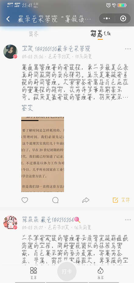 活动期间,学生会精心挑选《七年知青岁月》、《为结果而战》、《管理的实践》等优秀书籍推荐同学们阅读,引导同学们与书本为友,与高手对话,丰厚人生底蕴,提升文化素养。同学们积极响应,热情参与,坚持每天阅读,并在微信小程序上进行线上打卡,互相分享学习心得。通过读书分享活动,同学们不仅从这些书籍中获取了精神养料,还丰富了假期生活,促进了身心健康发展。学院也通过活动,引导同学们养成了“爱读书、爱分享;会读书、会分享”的好习惯,提高了同学们阅读思考的积极性和主动性,读书学习的氛围和风气进一步浓厚。活动于9月3日圆满结束,