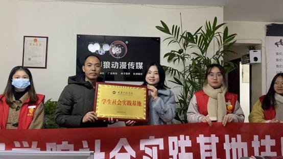 为提高大学生社会实践能力,增强新时代大学生社会责任感,2020年11月25日,数字艺术学院团委学生会团委副书记杨道珍老师和10名学生代表前往九龙坡袁家岗闪狼文化传媒有限公司举行了社会实践基地挂牌仪式。