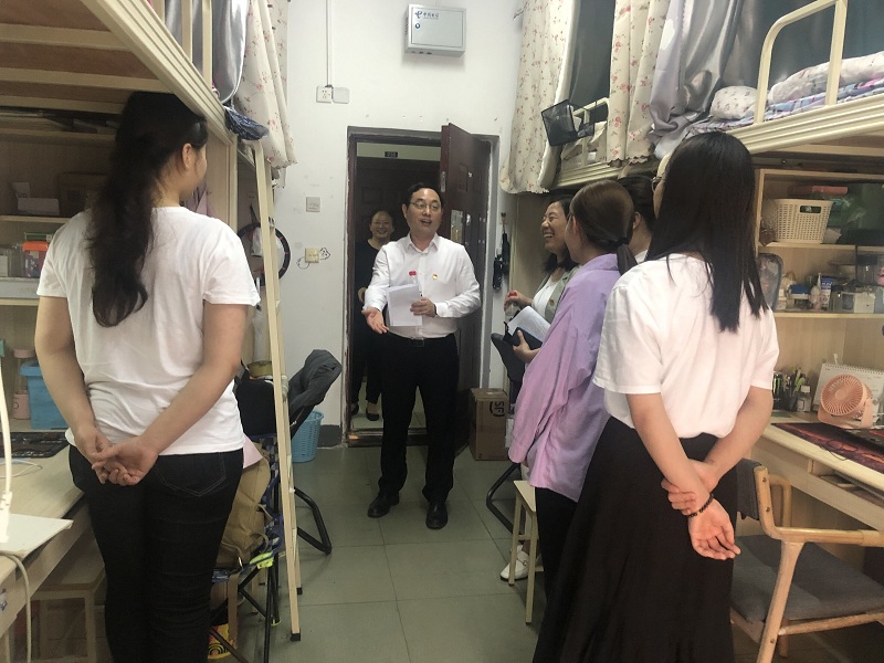 座谈会结束后,张业平副书记前往容园4号宿舍实地走访并看望学生,走访和交流的过程中,发现了一些细节问题并提出了整改建议,一是楼道消防通道门因为掉漆需要修缮;二是为了方便学生下雨天解决挂伞问题,建议学校统一在每个寝室门口统一设置挂钩,三是学生寝室上下床楼梯踏步出现夹脚或者打滑问题,希望相关部门能采取措施解决。
