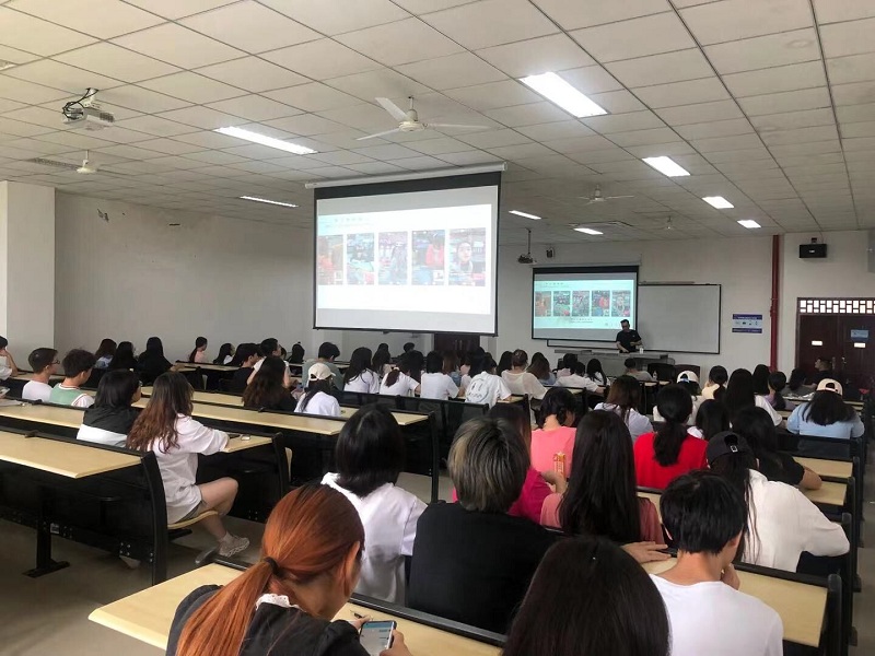 整个宣讲会分成了4个环节。首先是张老师对专业就业前景进行了讲解;其次是华青星播(重庆)文化传播公司CEO刘津川(2011届我校优秀毕业生)及其主创团队对同学们进行了行业动态,专业前沿进行了分享;然后现场举行了暑期实践招募;最后双方在数字艺术学院签订了校企合作协议。