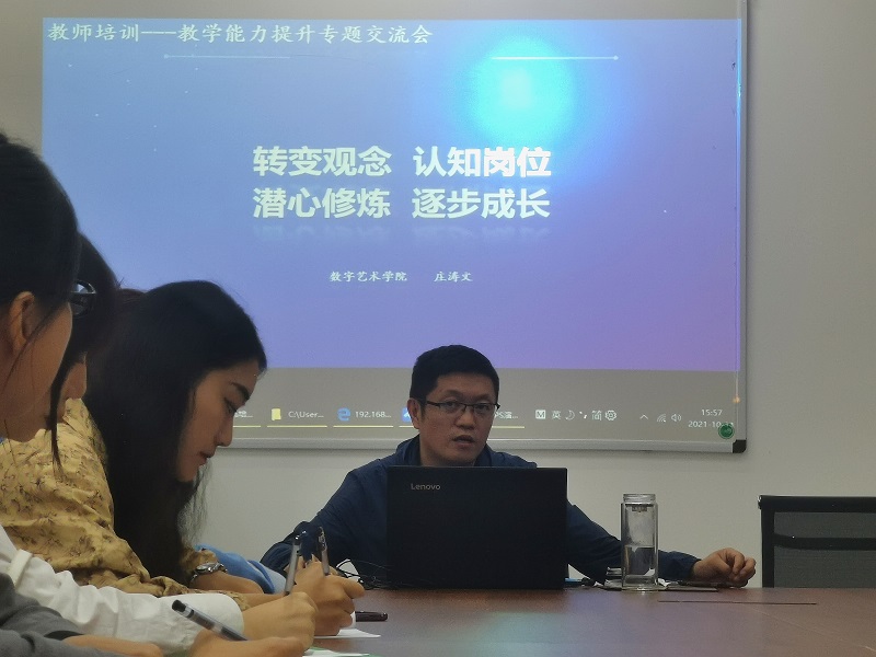 为进一步提升新教师教学能力和水平,加强教师交流与经验分享,2021年10月11日下午16点,数字艺术学院在5207会议室召开了新教师系列培训第四讲。培训主题为“转变观念认知岗位、潜心修炼逐步成长”——教学能力提升专题交流会,培训由副院长庄涛文主讲,全体新入职教师参加本次会议。
