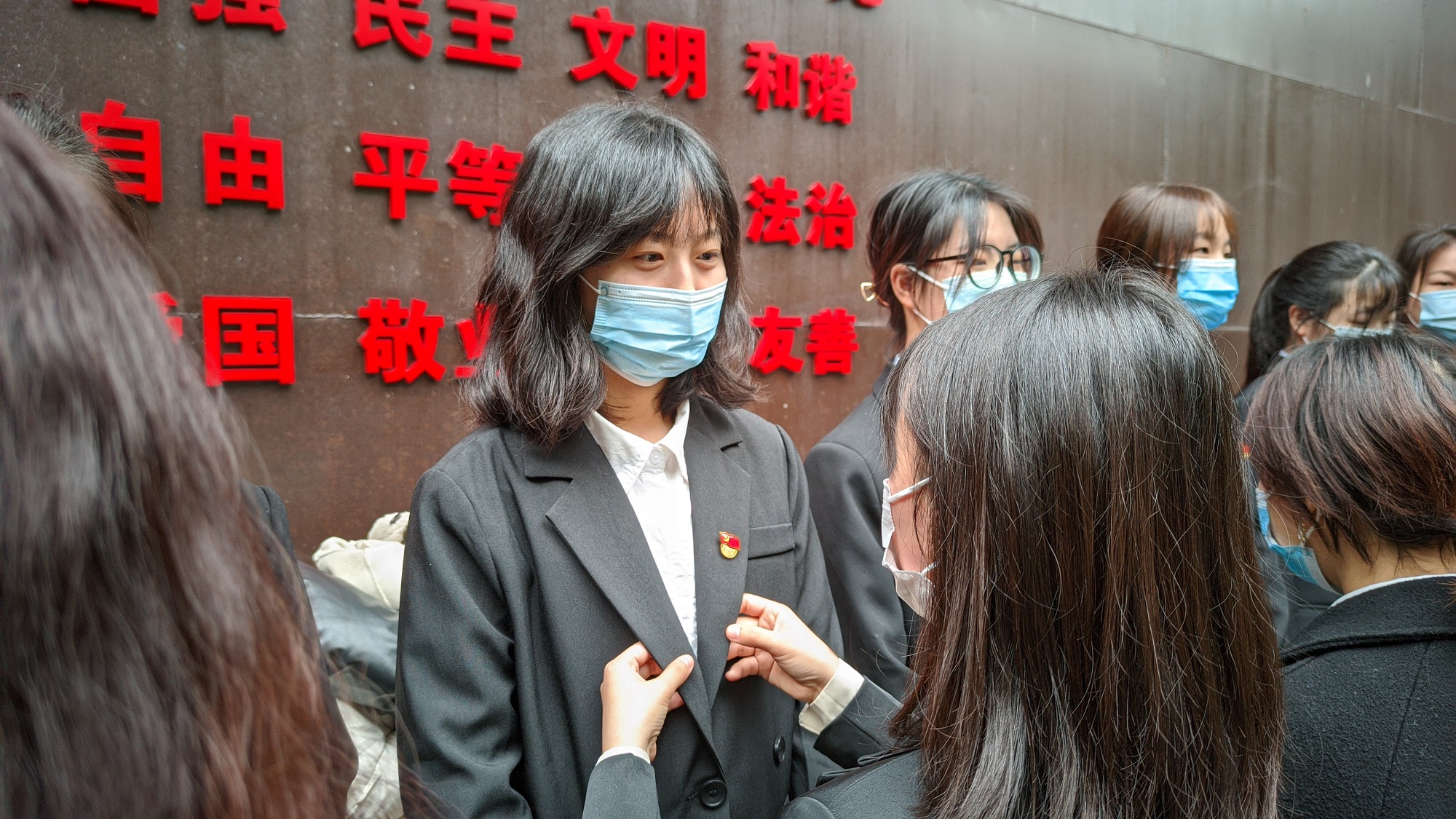 走出博物馆,同志们面向大写的“精忠报国”举起右拳许下铮铮誓言。随后举行老党员为新党员佩戴党徽仪式,一枚党徽传递着党员的责任和担当,鞭策着新党员牢记入党誓词,听党话、跟党走,不负胸前的闪耀。