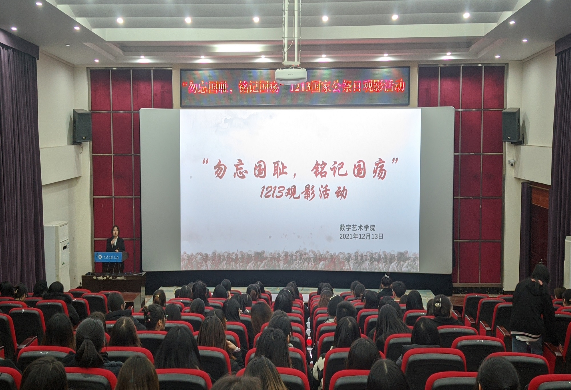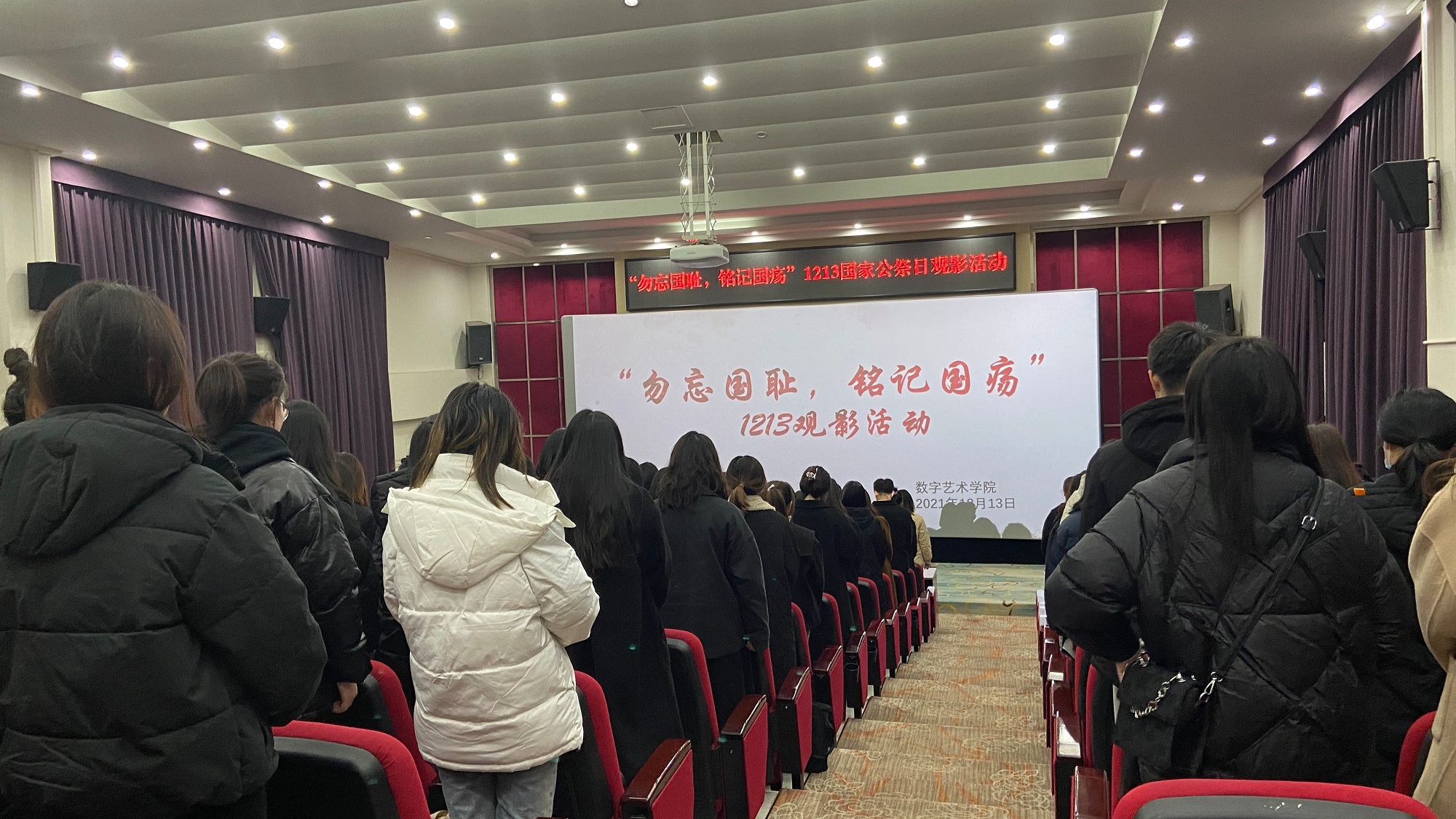 2021年12月13日下午6点,数字艺术学院学生党员实践教育中心在阶梯报告厅开展了“勿忘国耻,铭记国疡”国家公祭日观影活动。专职组织员周思琦出席本次活动,共有180余名同学参加。