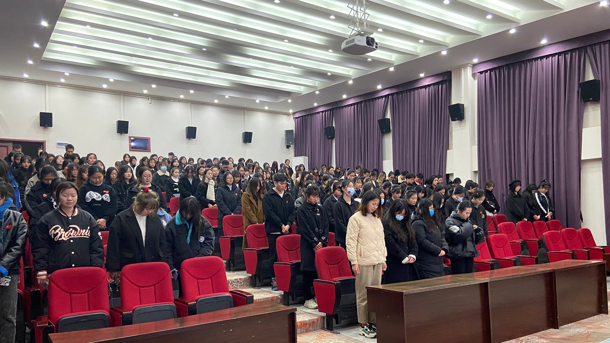 本次活动以主持人开展南京大屠杀历史知识竞答拉开序幕,竞赛调动了同学们学习历史和观影的积极性。紧接着集体观看记录影片《南京!南京!》。观看结束后,全体同志肃然起立,为死难者默哀一分钟,铭记历史,勿忘国殇。在沉痛哀悼后,全体同志再次起立,报告厅内唱响国歌,吾辈当自强,我们坚决守护中国人民,守护我们的家和祖国。