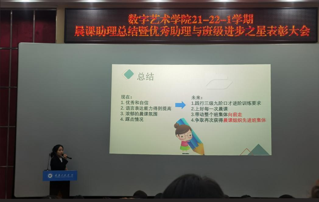 会上,数字艺术学院20级各专业学生代表上台发言。晨课助理叶佳文同学用“态度决定高度”、唐玉婷同学用“一个优秀的班集体离不开每个成员的共同努力”、 陈梅同学用“青春绽放自我"、柏薇同学用”踏实做好晨课工作“将各自团队的工作经验分享给大家;“班级进步之星”代表唐旭同学以自己的亲身感受告诉大家“演讲稿要亲民,演讲时要富有感情,打动观众的演讲才是好的演讲”分享自己的成长收获。分享结束后由学院徐小辉书记对本学期获得学院比赛前三名、学院优秀晨课助理团队、”班级进步之星“进行颁奖。
