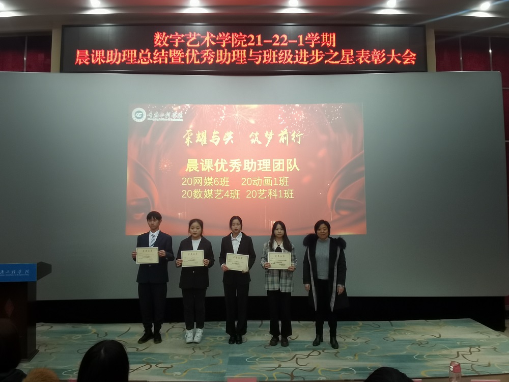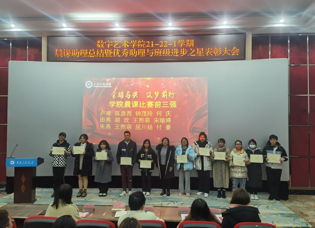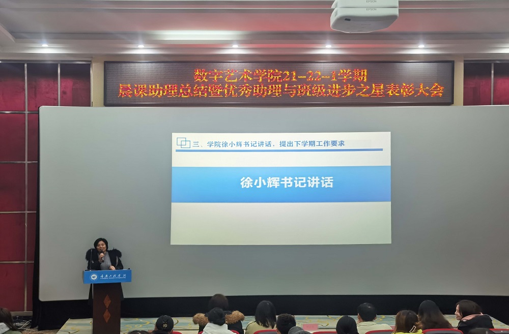 2021年12月27日13:00数字艺术学院于阶梯报告厅顺利召开2021-2022学年第一学期晨课总结暨表彰大会。出席本次会议的有数字艺术学院党总支书记徐小辉、全体晨课指导老师,以及晨课助理团及学院演讲冠亚军、班级进步之星全体同学共同参与,本次会议由周静同学主持。