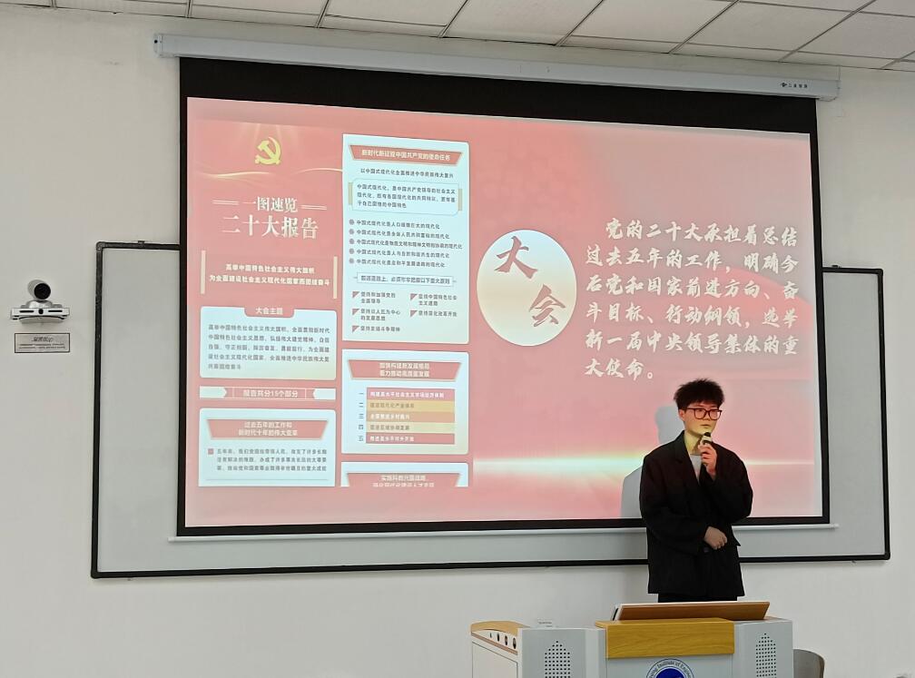 熊欢同志从学习二十大,响应“三个务必”时代号令进行领学,讲从“两个务必”到”三个务必”在新时代的重要意义。贺靖杰同志则以“肩负新时代新征程党的使命任务”为主题,从学习宣传和全面贯彻落实党的二十大精神和党中央决策部署,是当前和今后一个时期全党全国的首要政治任务为切入点,讲述新时代党的使命任务。王熙萌同志从“踔厉奋发新时代 勇毅前行新征程”学习贯彻党的二十大精神进行领学,对党的二十大报告中,总书记对青年和青年工作的重要阐述,进行细致学习。学习结束后全体同学结合本次学习内容交流心得,分享感悟。