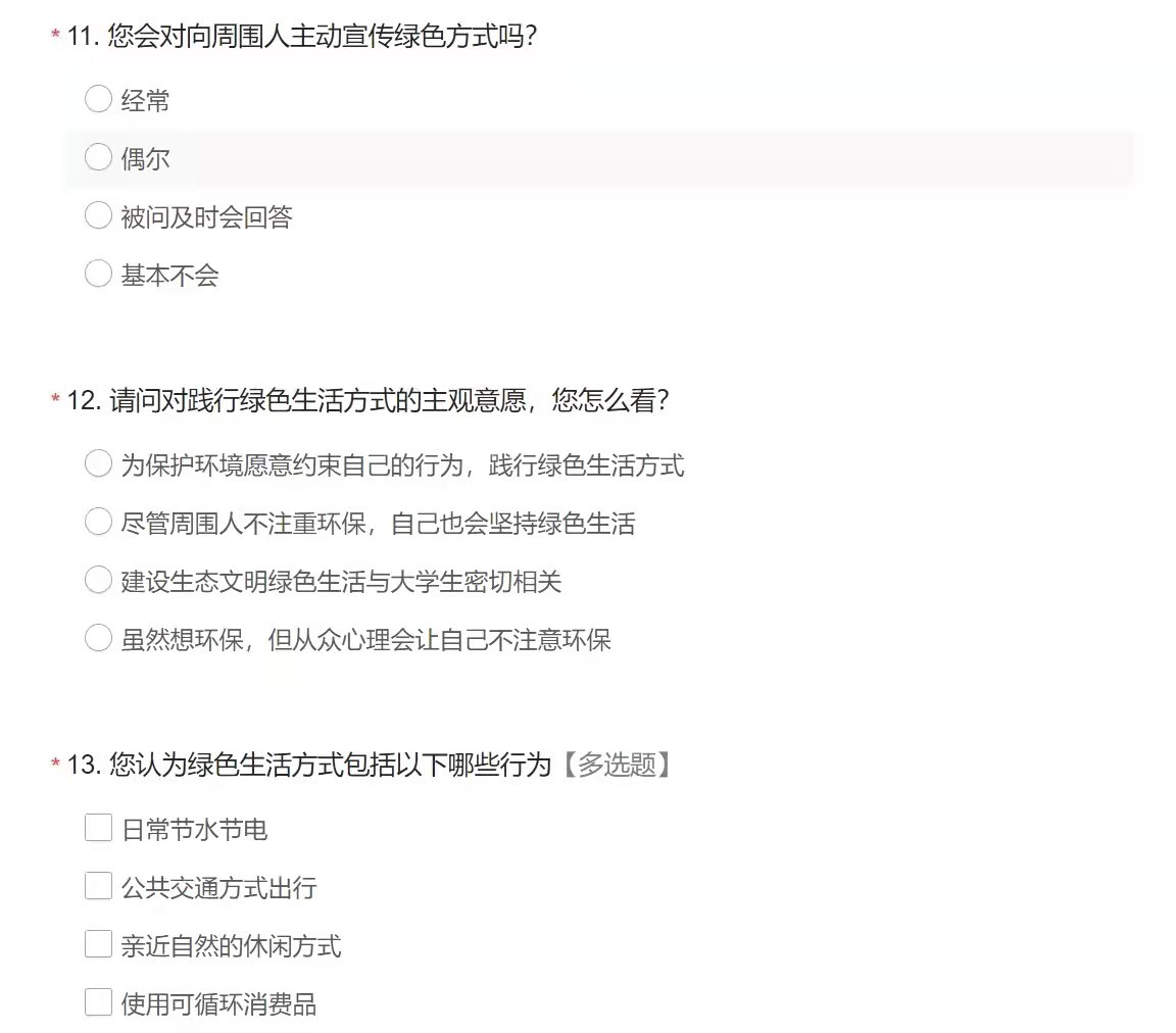 本次活动采用了线上问卷调查的方式,同学们积极参与,该活动培养同学们的绿色生活方式,同时也加强了对同学们的环保教育,更增强了学生的环保意识,为校园贡献了一份力量,提高同学们的责任感。通过本次活动,将环境保护与可持续发展思想渗透到各方面工作中,让校园成为自然环境优美、行为习惯文明的绿色校园。通过创建活动,提升个人素质,提升环境质量,提升学校品位,给全校师生营造一个良好的校园环境。