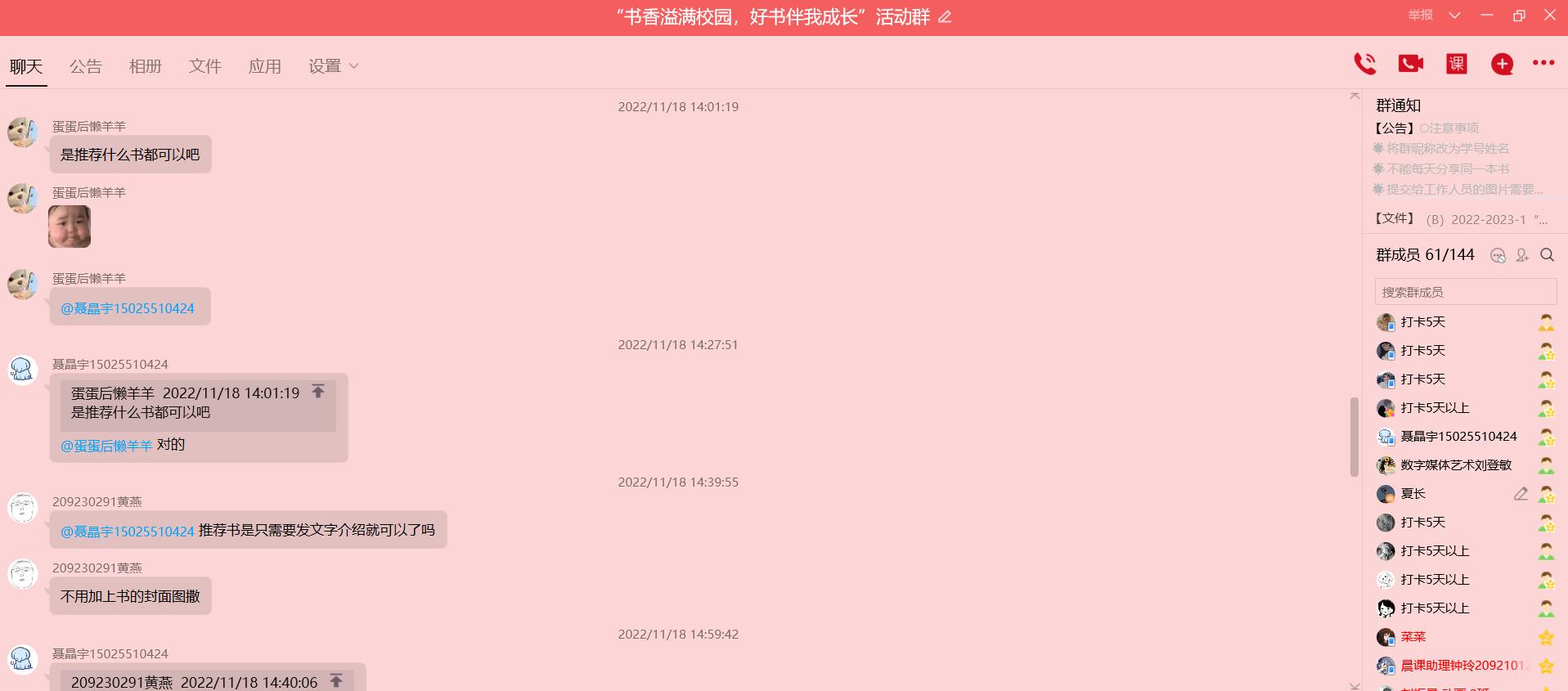 为了营造良好的校园学习环境,培养同学们的读书兴趣,提高同学们的文化、精神素养以及提高思维能力的散发。2022年11月14日—11月27日,重庆工程学院数字艺术学院关于“书香溢满校园,好书伴我成长”主题活动成功开展。