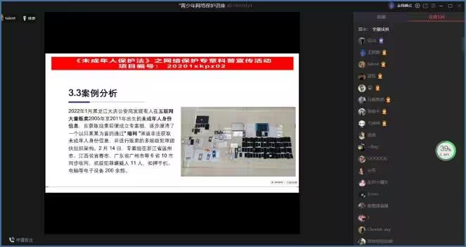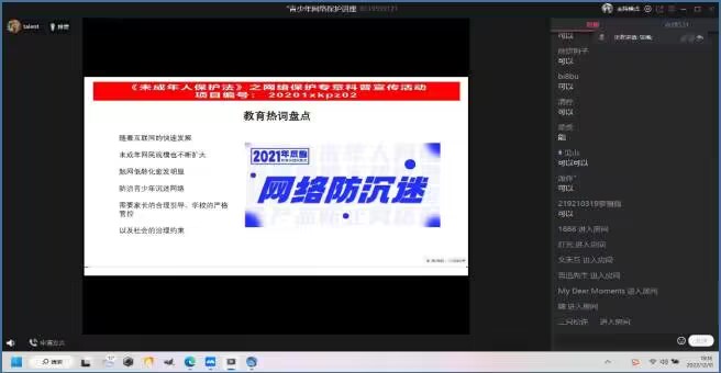为了加强青少年对网络安全的认知,2022年12月11日(周日)19:00,重庆工程学院志愿者协会牵头,举办了《E路平安——保护少年的你》科普讲座,该讲座由弋玮玮老师组织,由王佳同学主讲,科普团队全程参与,带领大家一起了解青少年网络安全教育。活动面相重庆工程学院全体同学。参加讲座人数约800人。