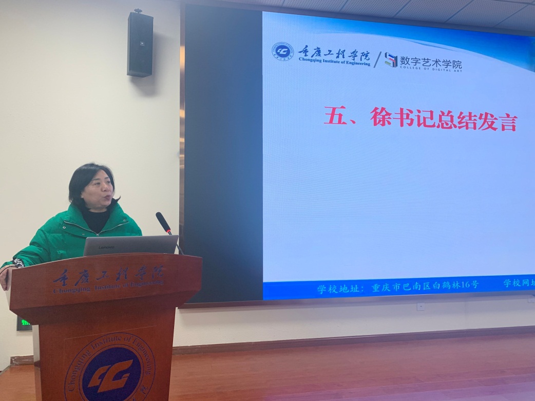 会议第四项,党总支书记徐小辉总结发言。她提出2023年学院工作的重点,一是持之以恒转作风,打造一支师德高尚的教师队伍;二是群策群力提质量,助推学生素质整体发展;三是集中精力抓教学规范,力争本科教学合格评估顺利通过;四是凝心聚力抓短板,精细管理促提升。