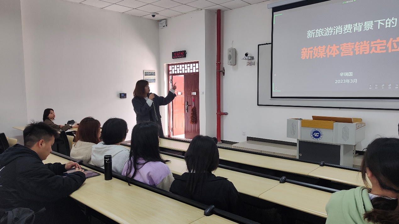 重庆市归初文旅发展有限公司致力于复合型文旅项目的规划,专注于文旅项目的研究、策划、规划、咨询、顾问、推广为一体的全方位服务机构。公司自创立以来,为重庆、四川、甘肃、宁夏、贵州等地服务近百个项目。辛瑞国先生具有丰富的一线从业经验和扎实的实战功底。本次讲座就新时代背景下旅游构成要素、消费背景、打造网红景区、场景化特征、新媒体营销定位、重庆的旅游发展情况进行了详细讲解。从数据分析到理论支撑再到实战案例的应用,由浅入深,娓娓道来,向同学们详细地指导。