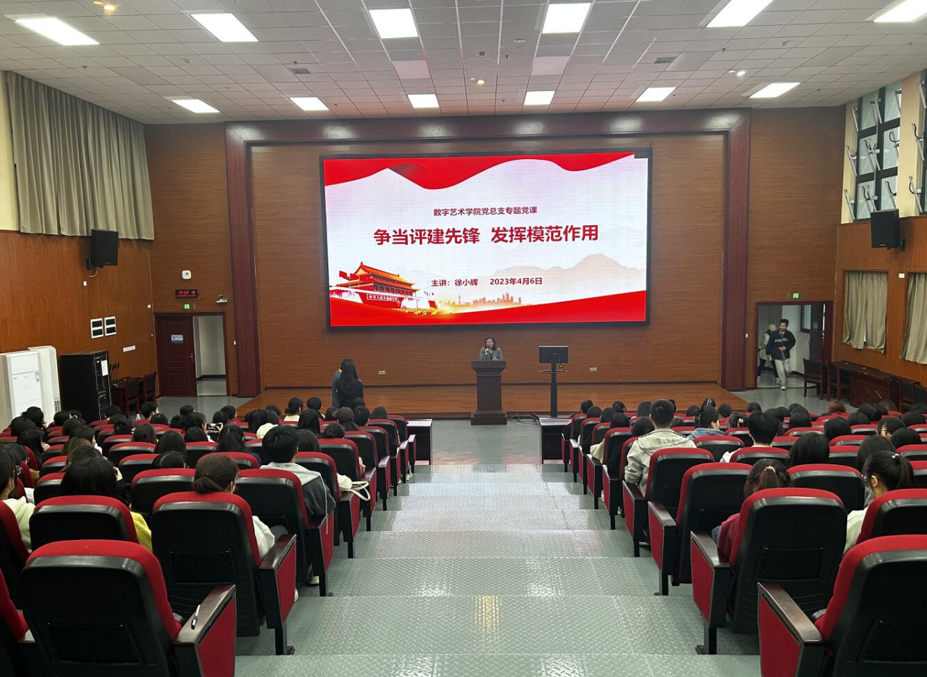 本网讯(文/图 数字艺术学院李毅)4月6日晚上,数字艺术学院党总支在第七教学楼报告厅开展“争当评建先锋 发挥模范作用”专题党课,党课由党总支书记徐小辉主讲,学院150余名学生党性分子参加。