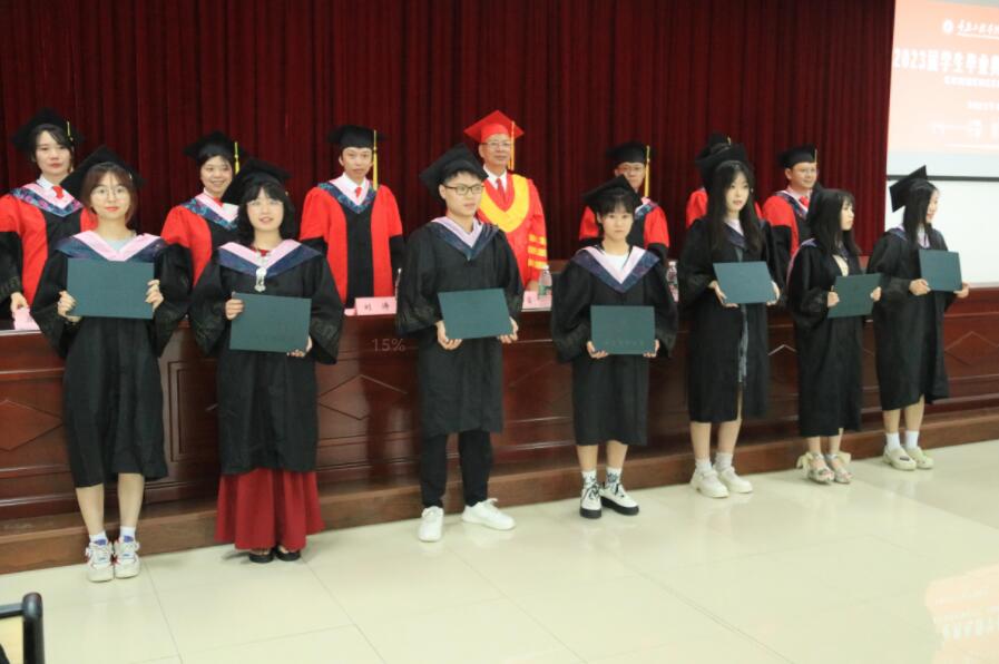 在庄重热烈的气氛中,全体人员垂手肃立,齐唱国歌,典礼正式开始。副院长庄涛文宣读重庆工程学院学位评定委员会关于2023届601位本科生学士学位授予的决议,并向所有获得学位的同学们表示衷心的祝贺!学院学位评定分委员会委员依次为毕业生颁发学位证书,扶正流苏,与毕业班亲切交谈,留下珍贵合影。接着,毕业生代表为学位评定分委员会的老师们赠花,感谢老师们的辛勤付出和悉心指导。