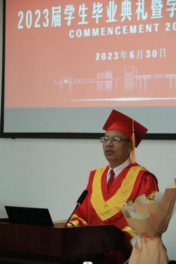 最后,杨开富作重要讲话,他向学院2023届全体毕业生送上最热烈的祝贺和最美好的祝愿,同时为大家送上毕业赠言。希望同学们做到坚守“四颗心”。一是坚守一颗忠诚的爱党爱国之心;二是坚守一颗笃定的中华民族自信之心;三是坚守一颗锲而不舍的求学奋进之心;四是坚守一颗甘于奉献与服务的赤子之心。