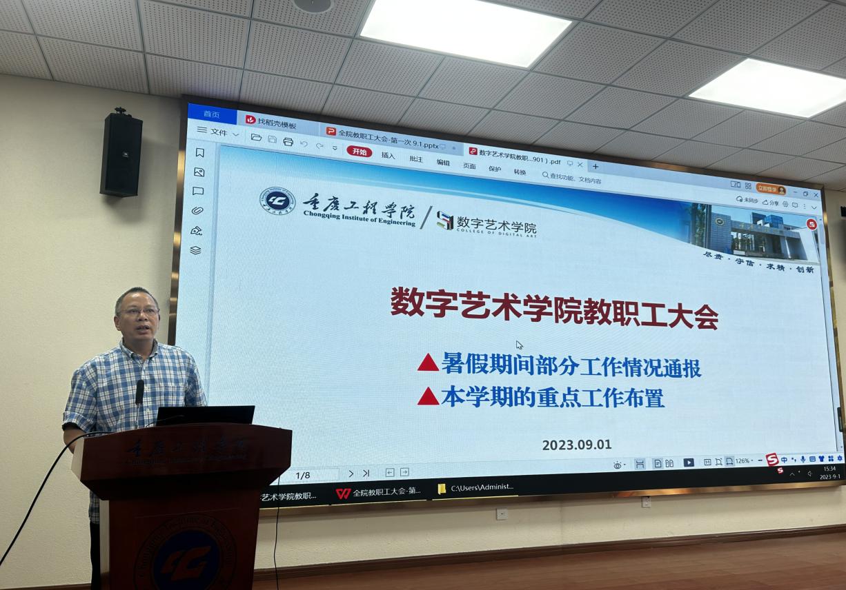 本网讯(文/图 综合办公室胡娟)2023年9月1日下午,数字艺术学院在行政楼第四会议室召开2023-2024学年第二学期新学期教职工大会。会议由学院办公室李毅主持,院长杨开富出席会议并发表重要讲话,学院全体教职工参加。